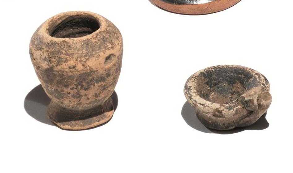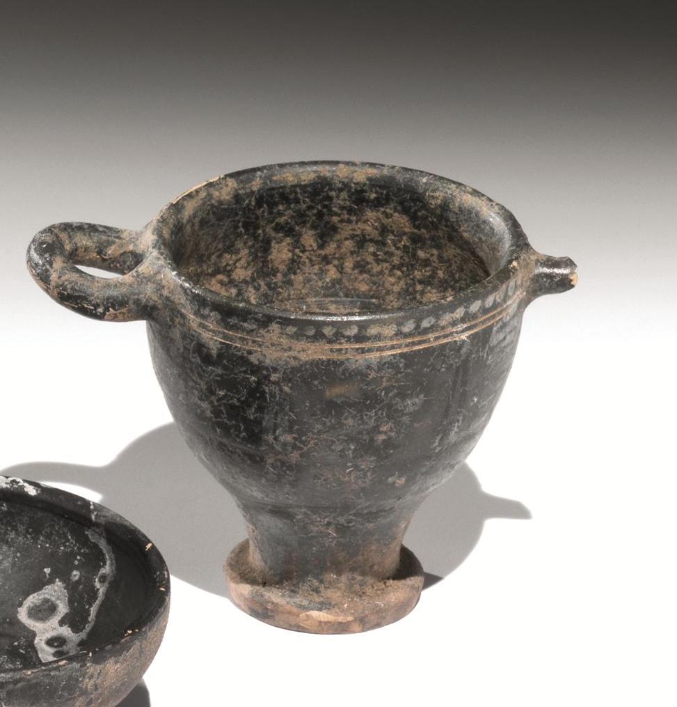 Materia e tecnica: argilla figulina rosata, vernice bruna, suddipinture in bianco avorio, modellati a tornio veloce