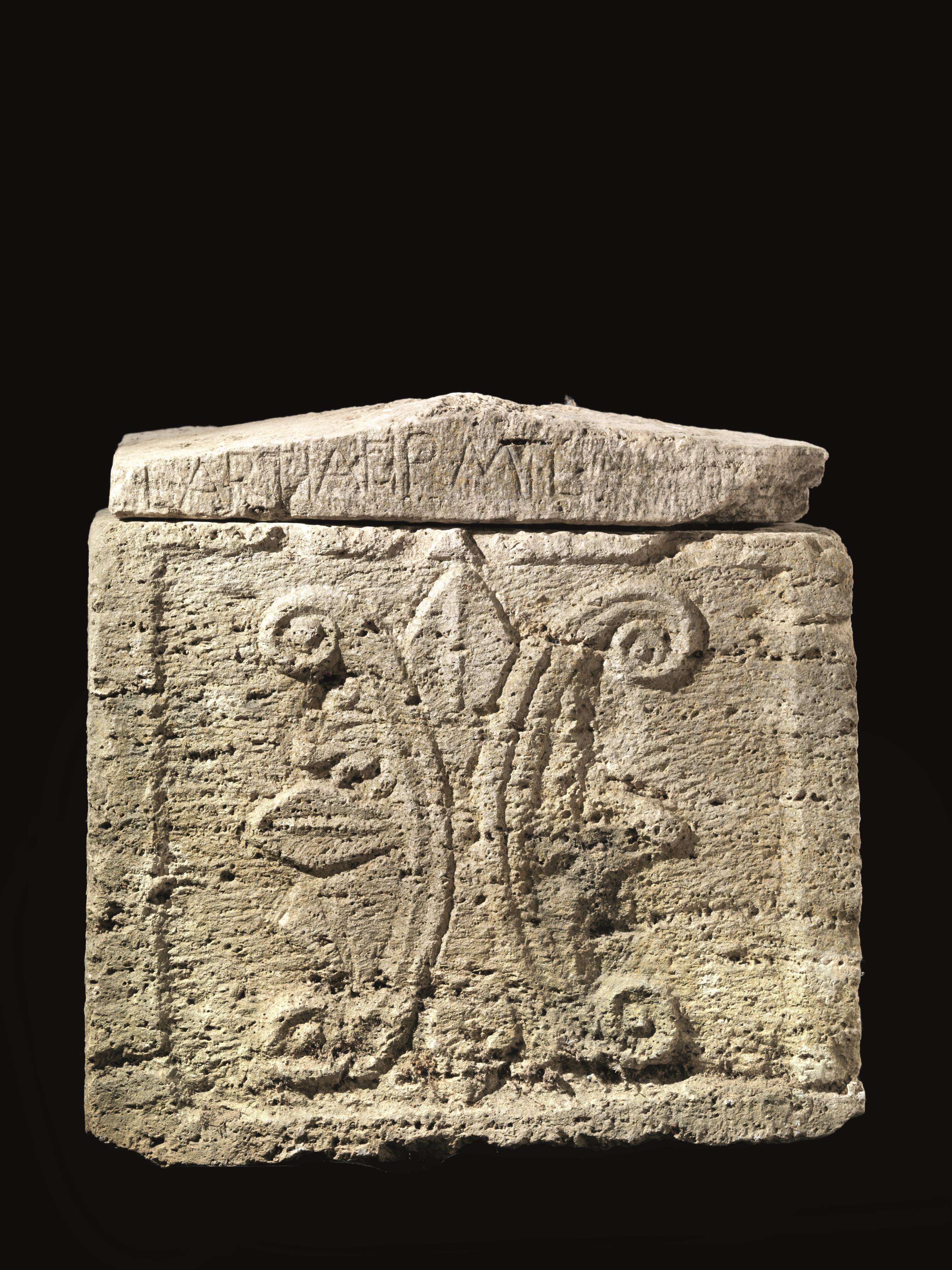 Grande urna in travertino di forma quadrangolare, sul fronte è scolpito entro una tabella ribassata un motivo floreale stilizzato a volute contrapposte; il coperchio displuviato presenta un’iscrizione destrorsa in caratteri latini