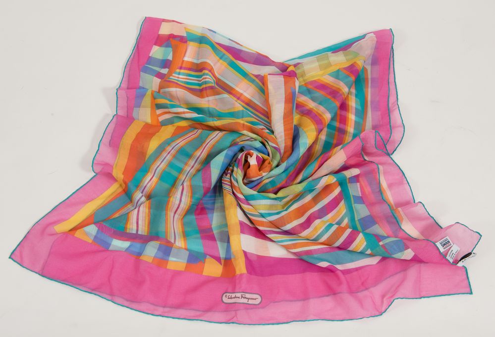 Lot 16 | SALVATORE FERRAGAMO Foulard seta e cotone con motivo multicolore. Cm 87x174....