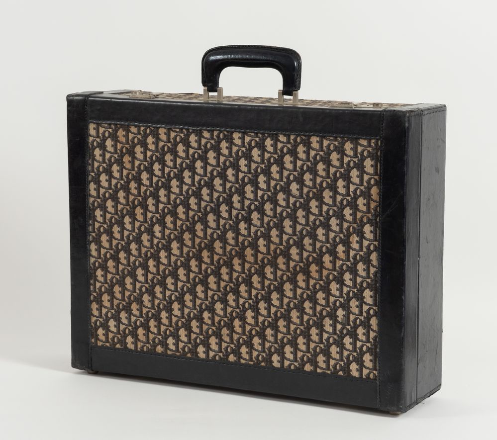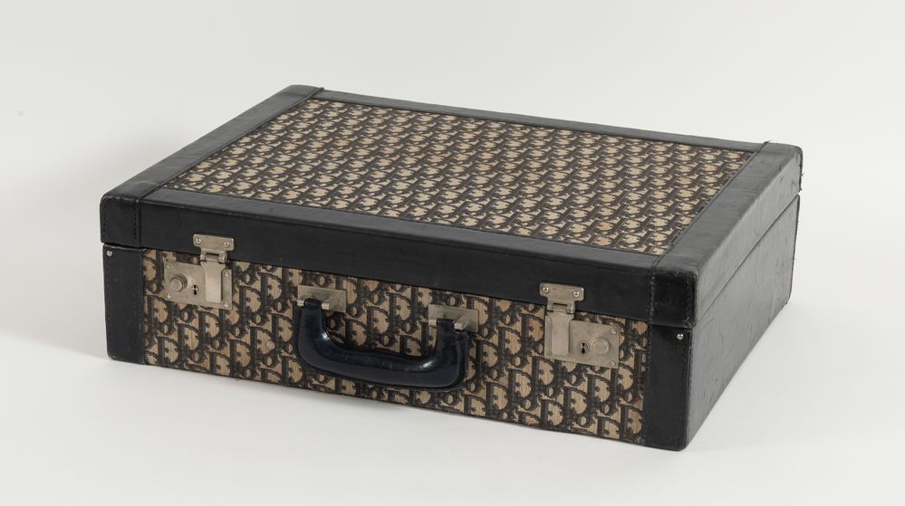 CHRISTIAN DIOR Baule da viaggio con classico motivo monogramma e inserti in pelle. Cm 40x50x15