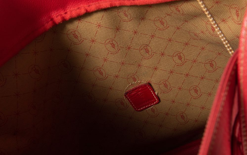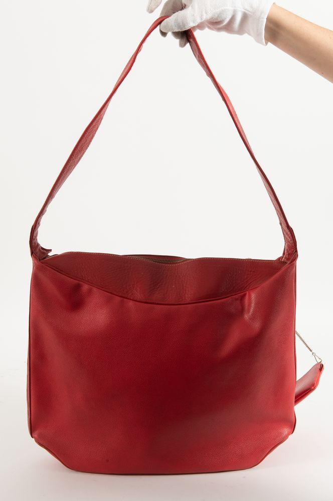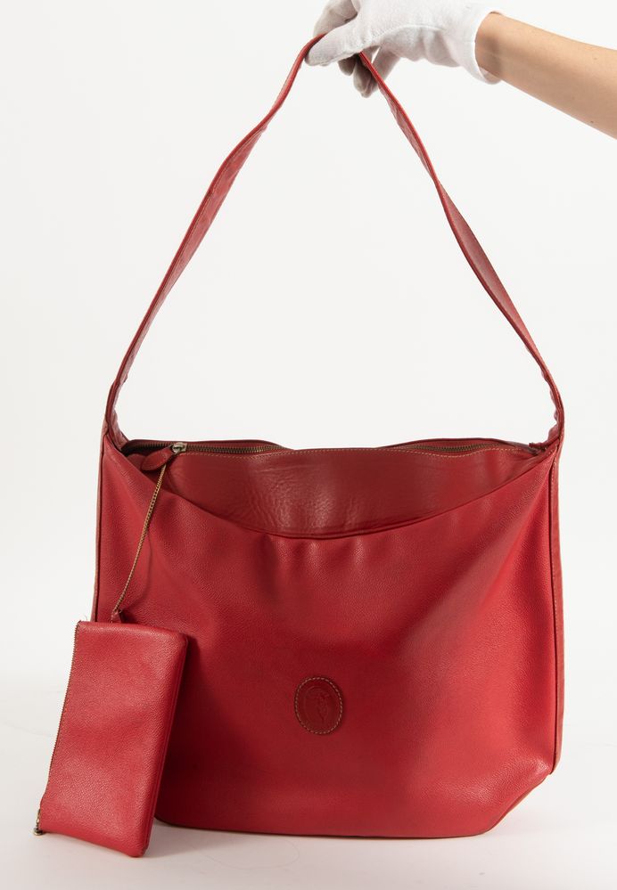 TRUSSARDI Borsa da spalla in tela martellata e pelle di colore rosso. Cm 35x42x8. Lunghezza manico: cm 72. Reca marchi e logo Trussardi, Made in Italy. Corredata di piccola pochette porta monete legata all'interno.