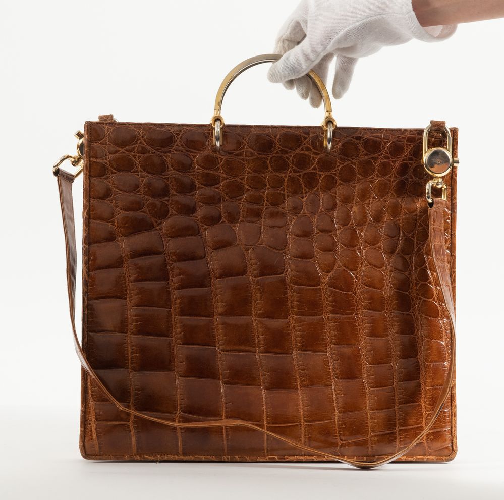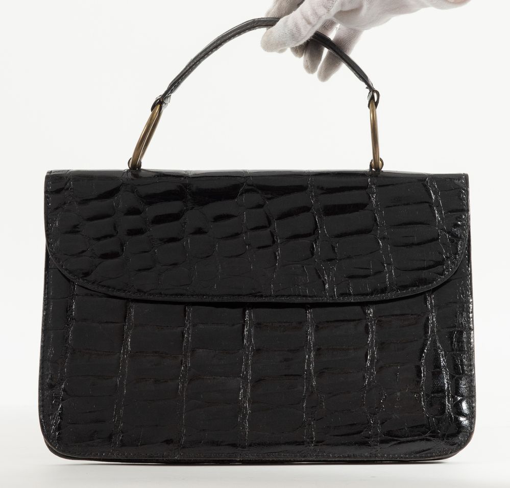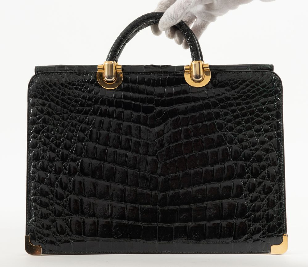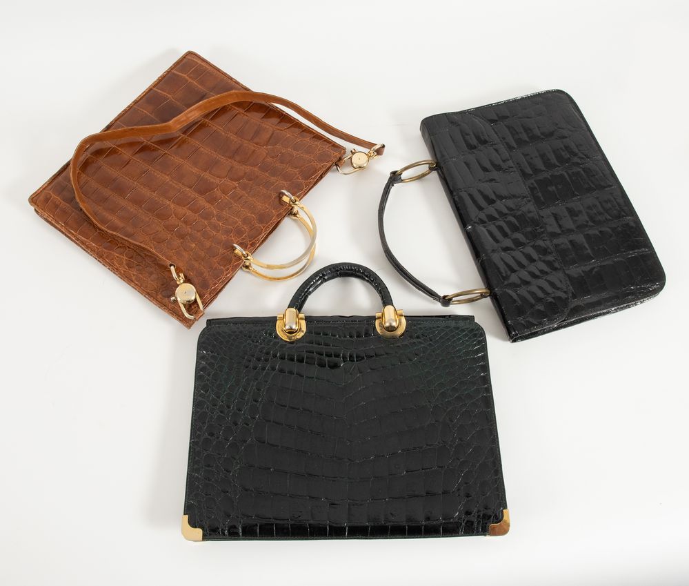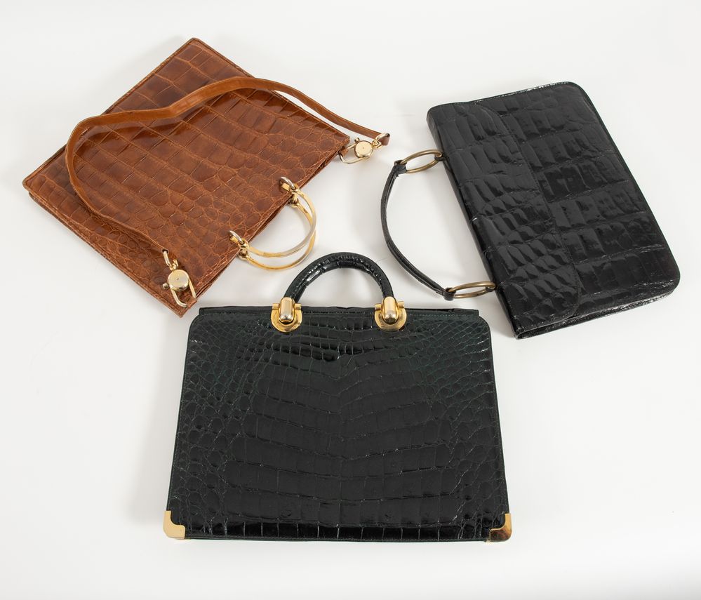 ANONIMO Lotto composto da 3 borse in pelle stampata a coccodrillo nei colori del nero, verde scuro e mattone. Rispettivamente di misure: cm 26x36,5x3; cm 29x39x3; cm 31,5x35x10 (Difetti)