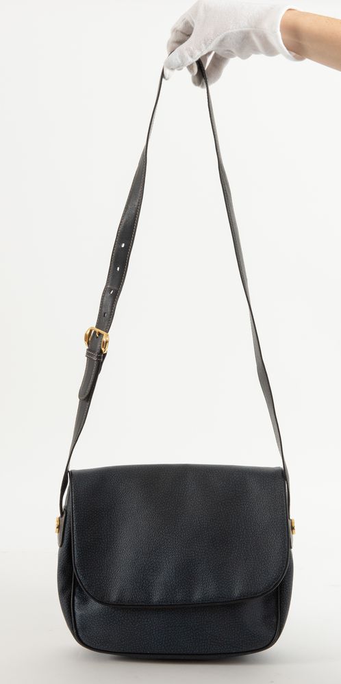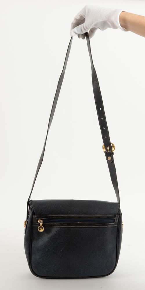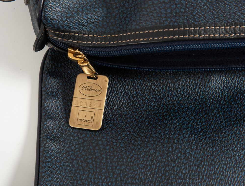 BORBONESE X REDWALL Borsa a tracolla regolabile nel classico motivo occhio di pernice blu rifinita in pelle. Cm 23x26x8. Lunghezza massima tracolla: cm 118. Reca codice di riferimento prodotto e marchio Made in Italy.
