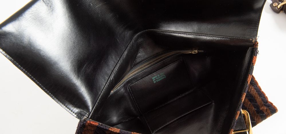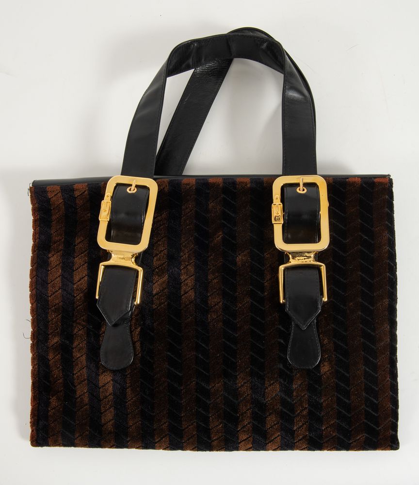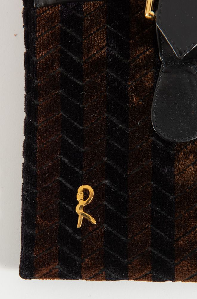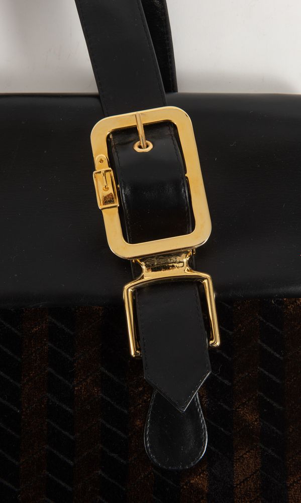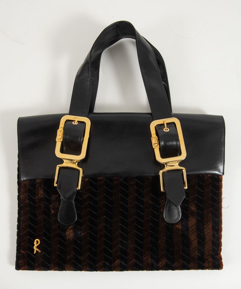 ROBERTA DI CAMERINO Borsa da spalla in velluto e pelle con dettagli a fibbia in metallo dorato. Interno rifinito in pelle nera. Cm 27.5x35.5x2. Reca marchio Made in Italy by Roberta di Camerino.