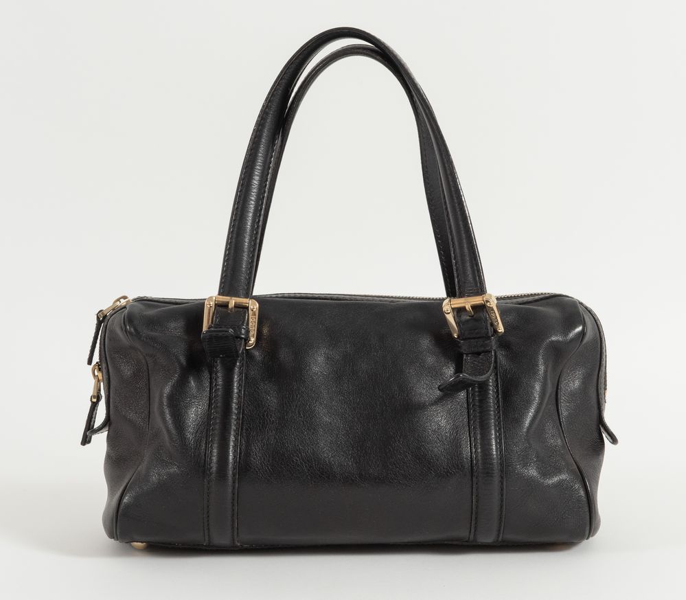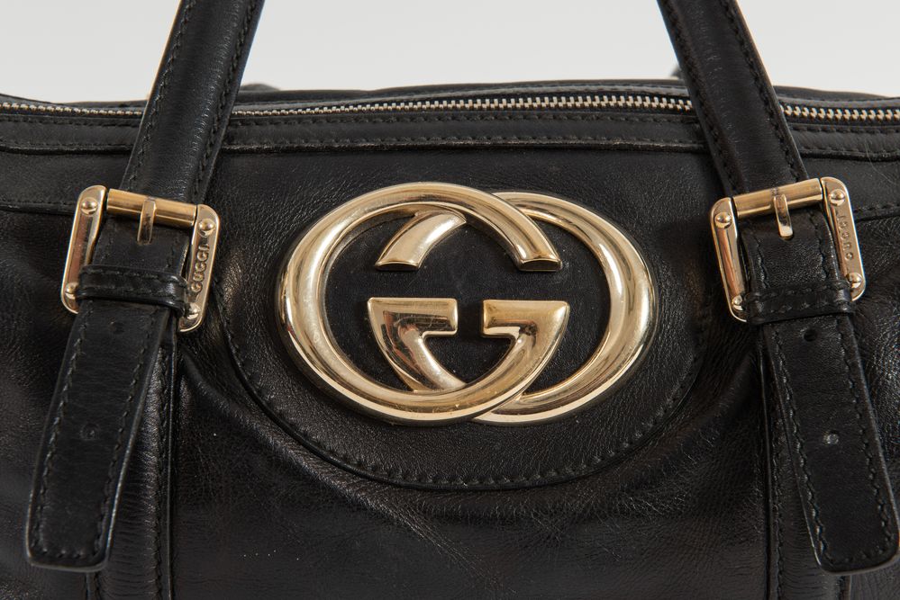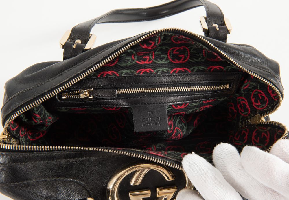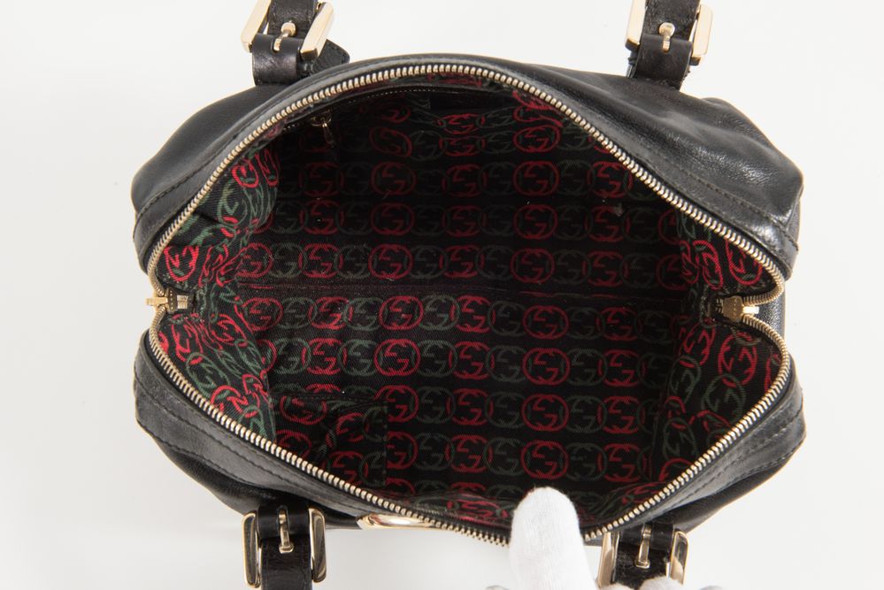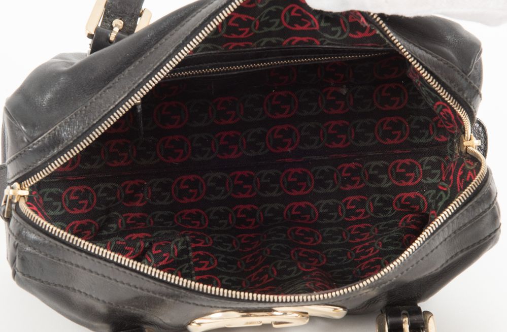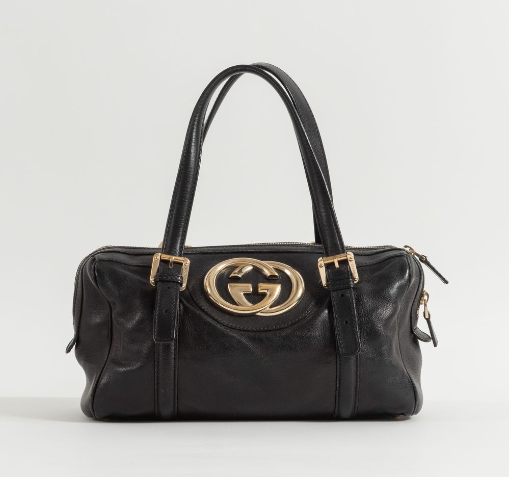 GUCCI Borsa modello Britt Boston in pelle morbida nera rifinita con dettagli e marchio GG in metallo dorato. Cm 14x30x10.Lunghezza manici: cm 54 cad. Rivestimento interno in cotone a fantasia logata GG. Reca codice di riferimento prodotto e marchio Gucci Made in Italy.