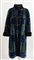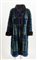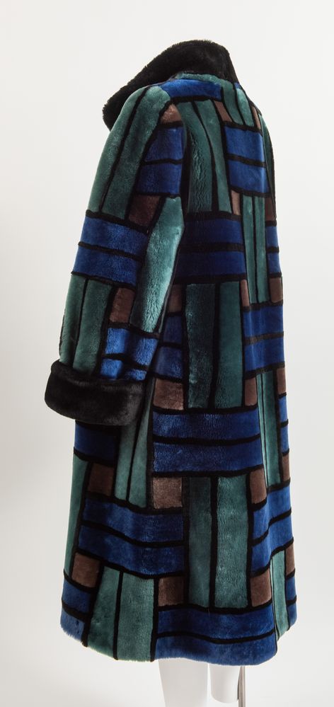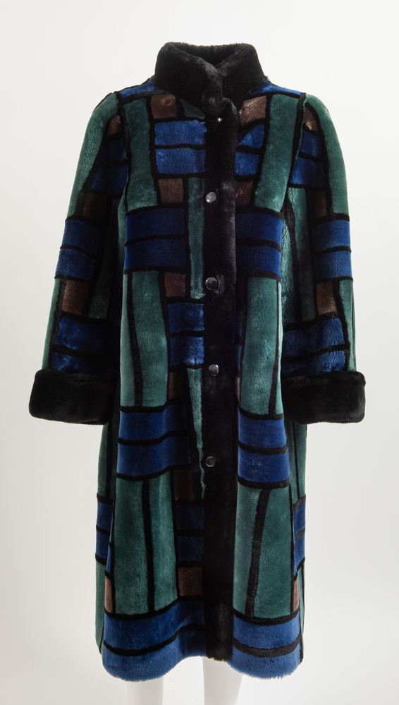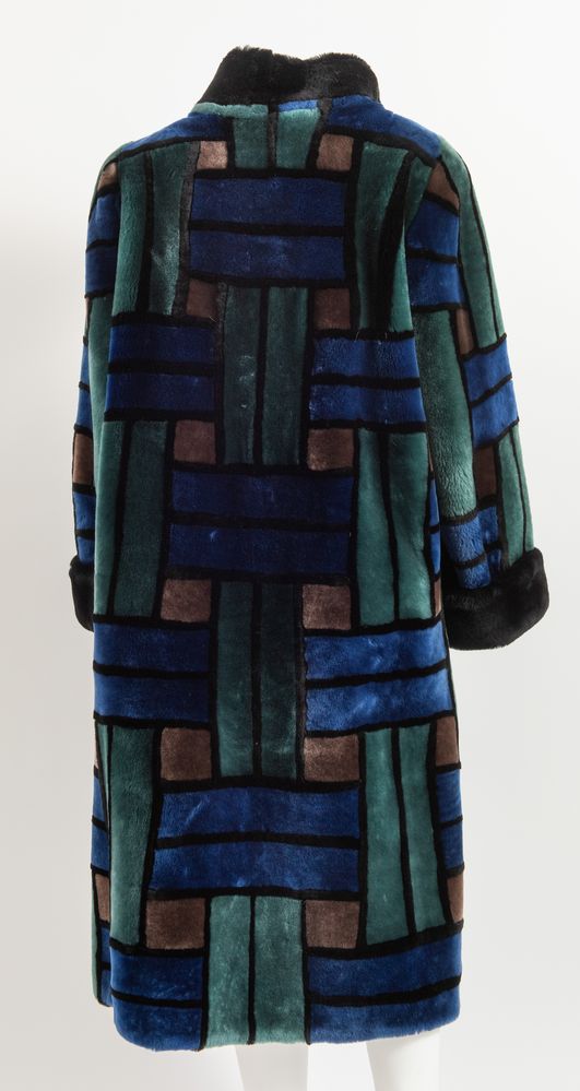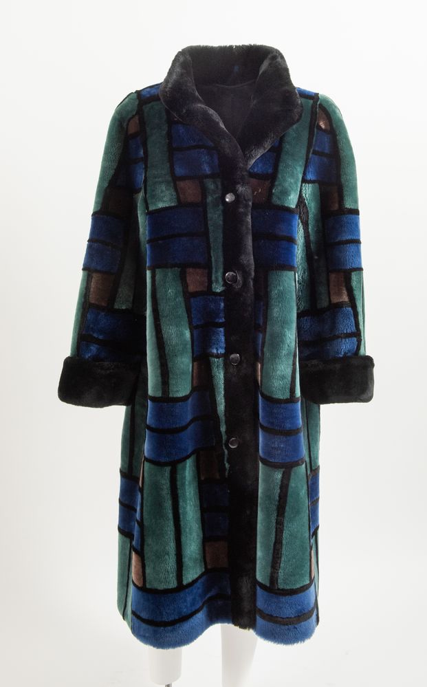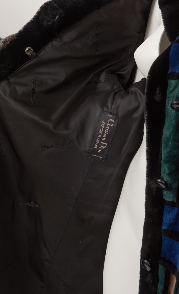 CHRISTIAN DIOR Boutique Fourrure Montone lungo con tasche a fantasia geometrica sui toni del verde, blu, nero e marrone. Interno rifinito in seta nera interamente logata Christian Dior. Taglia non riportata: 44/46 ca. Reca etichetta Christian Dior Boutique Fourrure Paris Made in France.