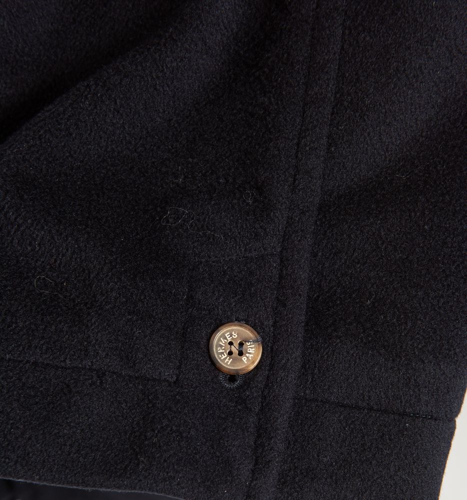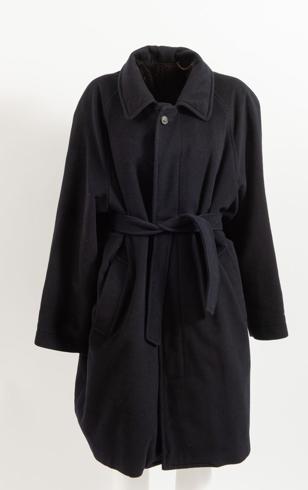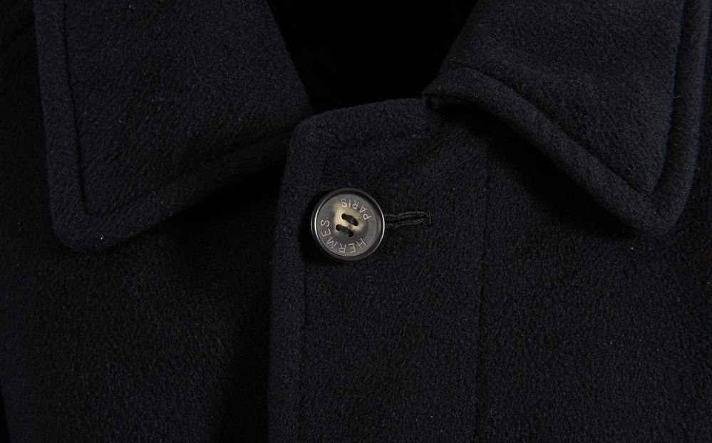 HERMÈS Cappotto maschile in lana blu scuro con cinura. Interno rifinito in marmotttino marrone. Taglia non riportata: L/XL ca. Reca marchi Hermès Paris.