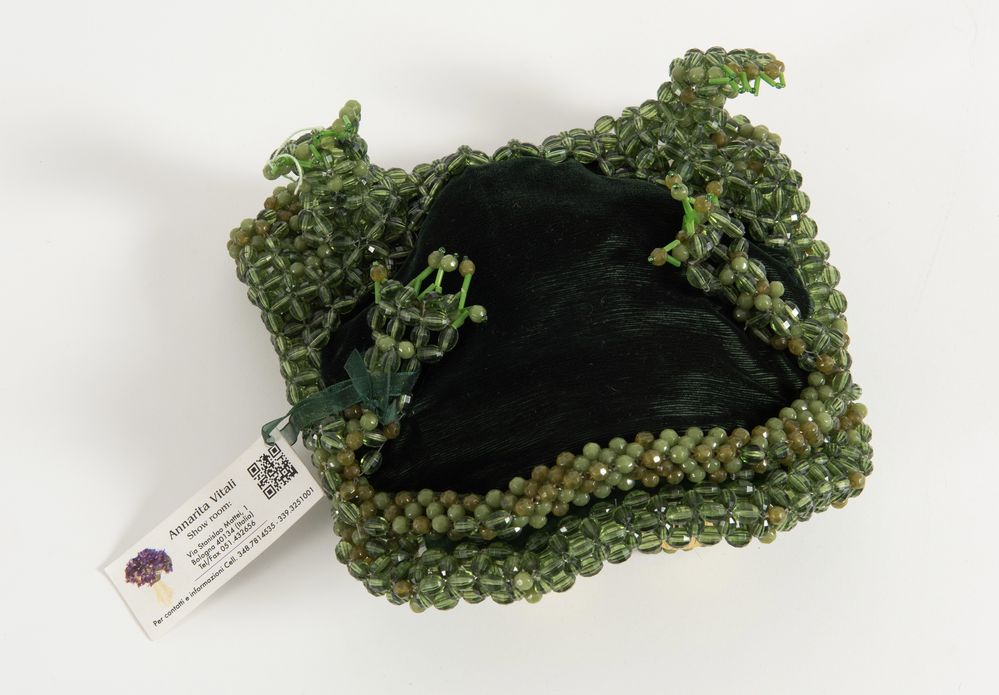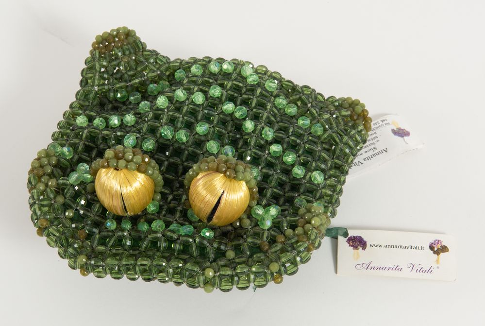 ANNARITA VITALI Borsa handmade a forma di Rana interamente lavorata con cristalli vintage in resina e occhi in rafia. Anni 2000. Cm 19,5x19,5. Pubblicazioni: Rivista Elle, marzo 2005.