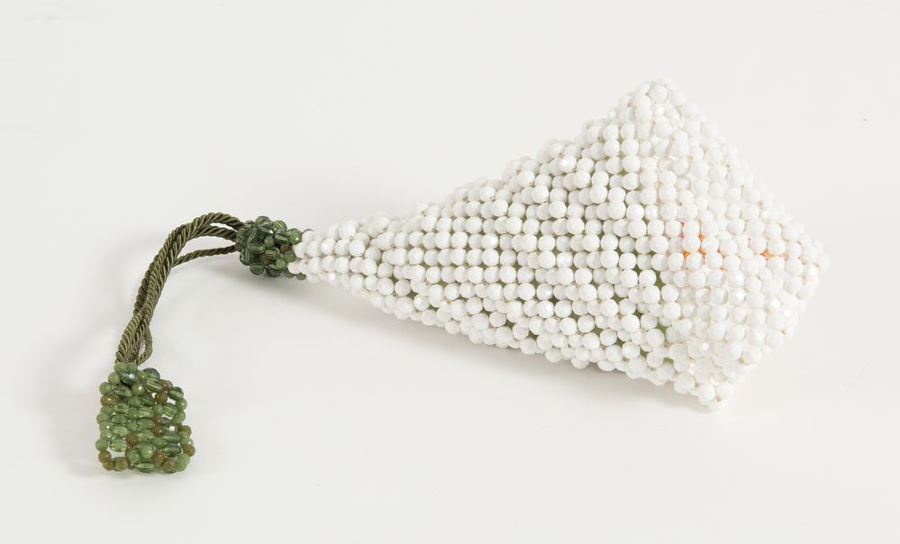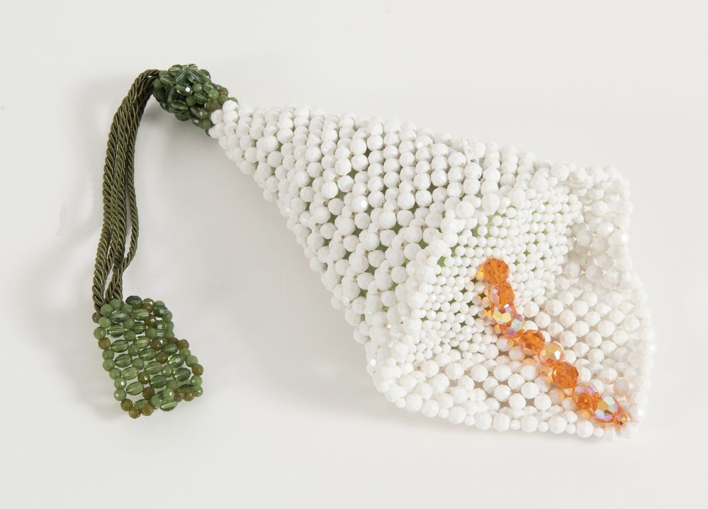 ANNARITA VITALI Borsa a mano a forma di calla interamente lavorata con perline e cristalli di plastica. Collezione 2004. Cm 30x15x10. Manico in corda di cm 16. (En suite con il lotto successivo)