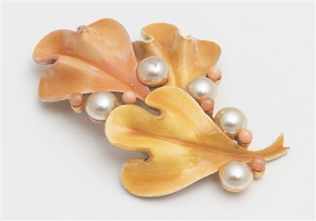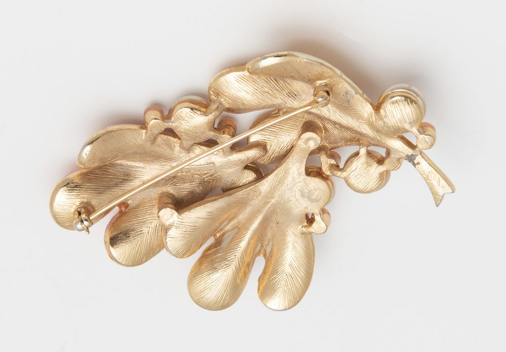BEN AMUN Spilla in metallo dorato e smaltato decorata con perle sintetiche. Cm 8,5x6. Reca marchio a fuoco della maison. (Difetti)