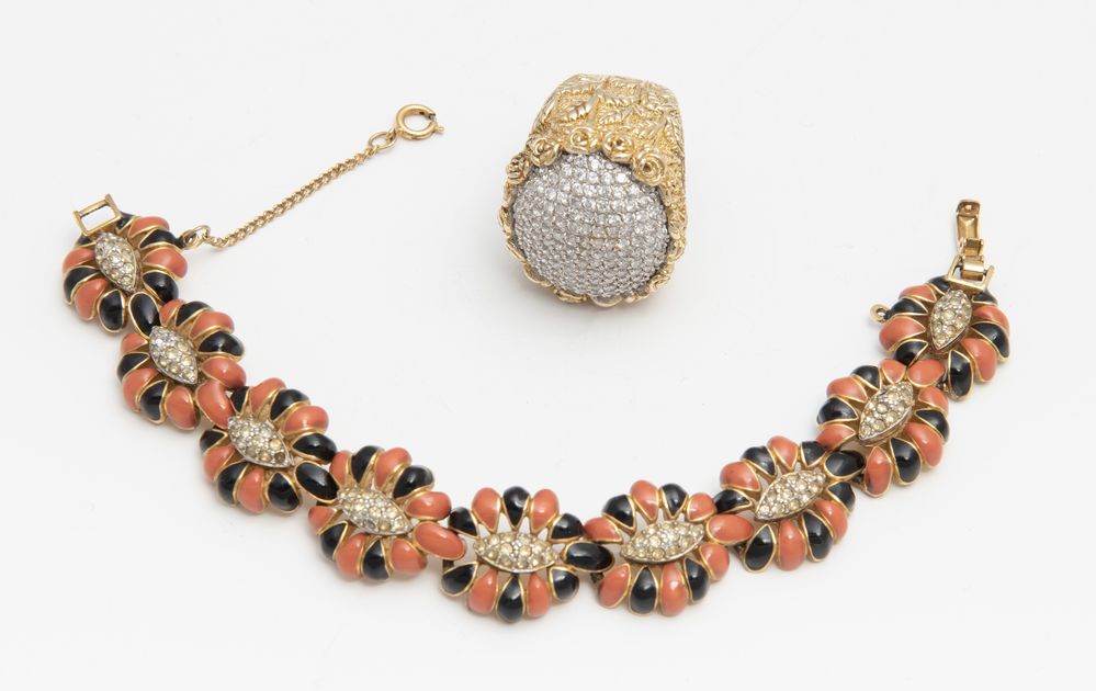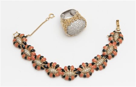 ANONIMO Lotto composto da anello e bracciale in metallo dorato decorati con pavè di zirconi e smalti. Bracciale: cm 18; Anello: misura 18.