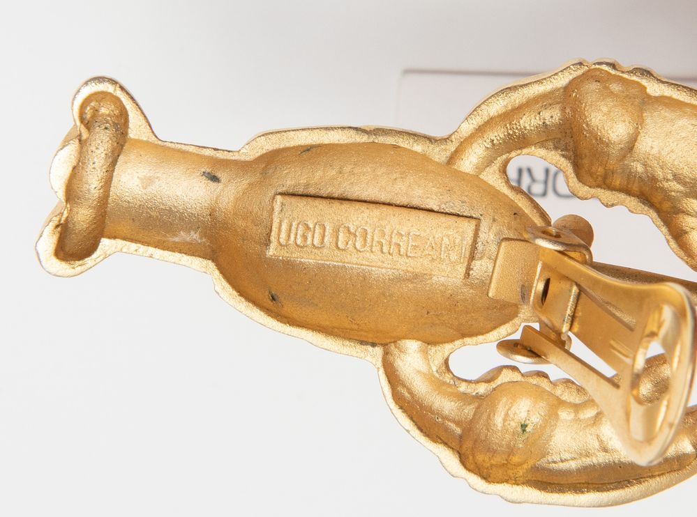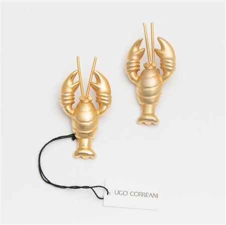 UGO CORREANI Orecchini a clips dorati con aragoste. Cm 5.8 cad. Recano marchio a fuoco della maison ed etichetta originale.
