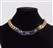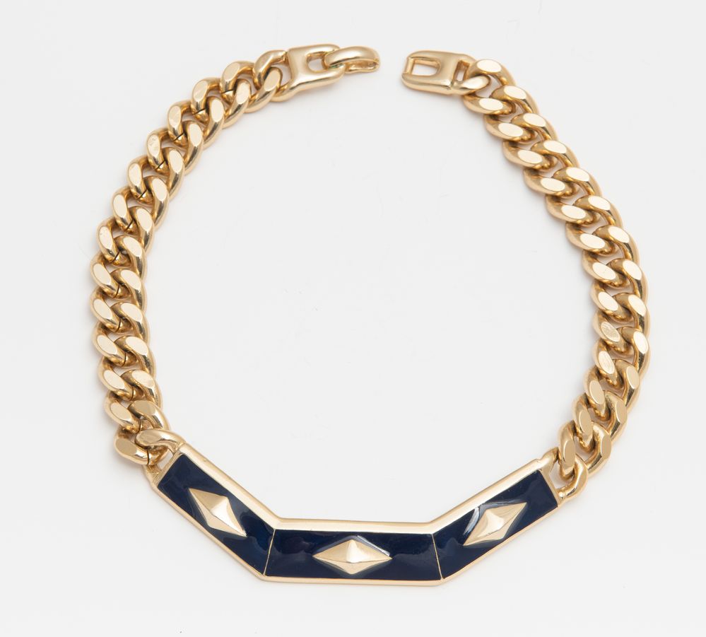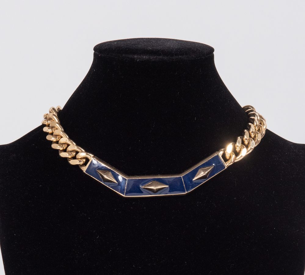 HELENA RUBINSTEIN Collier con catena grossa dorata. Decorata con elementi dorati a mandorla su smalto blu scuro. Reca marchio della maison ed etichetta originale.