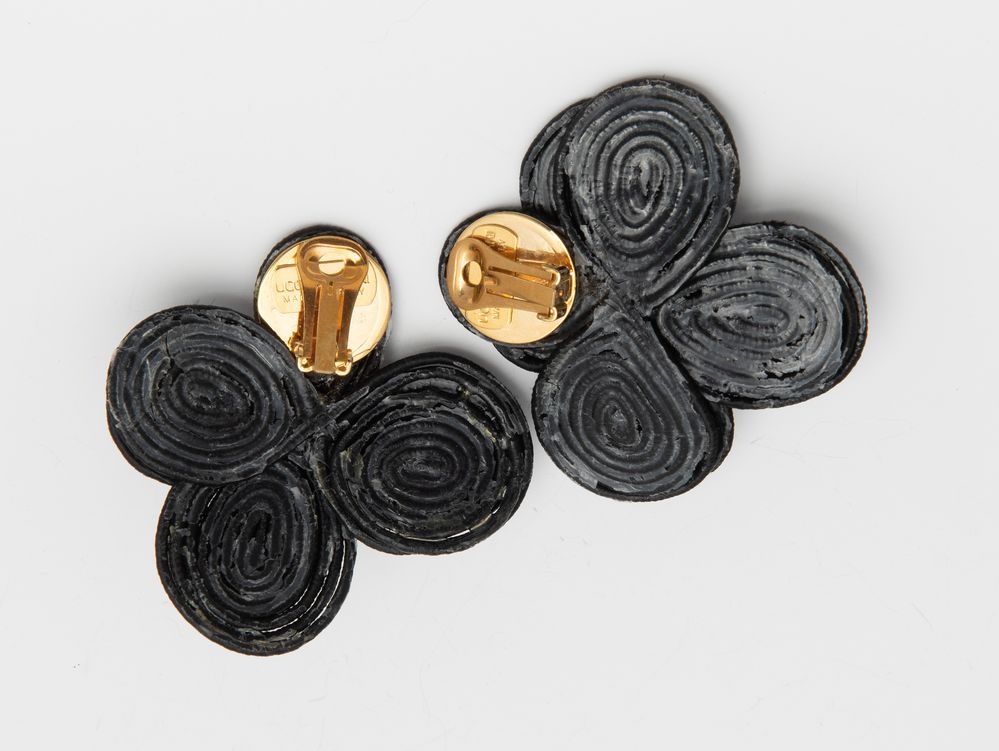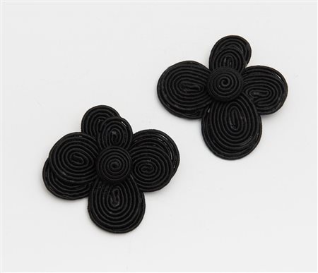 UGO CORREANI Orecchini a clips con fiore in cordino laccato nero. Anni '80. Cm 6 cad. Recano marchio a fuoco della maison.