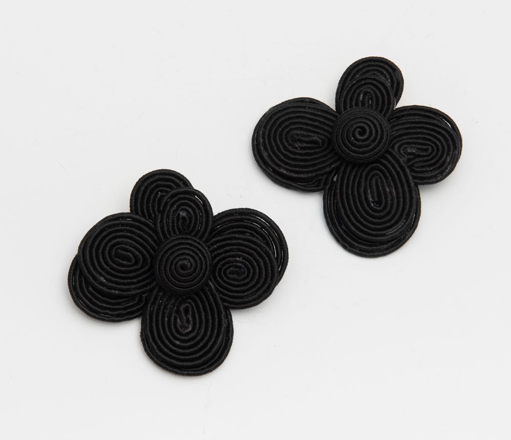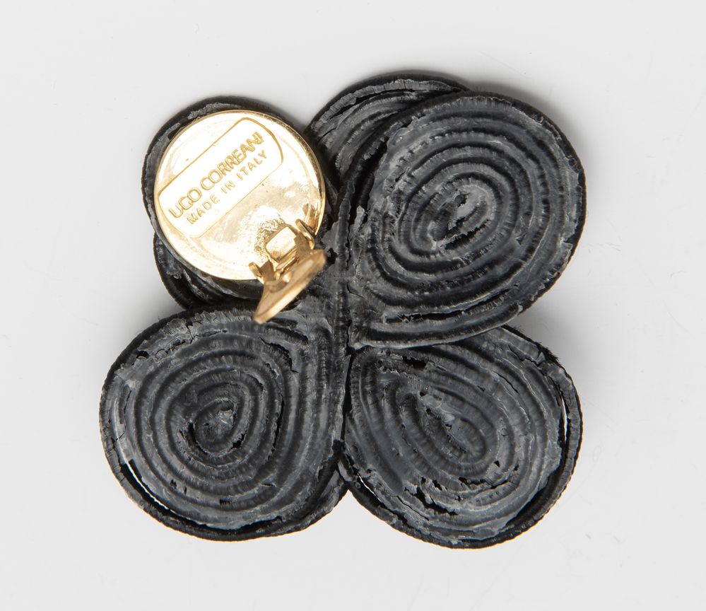 UGO CORREANI Orecchini a clips con fiore in cordino laccato nero. Anni '80....