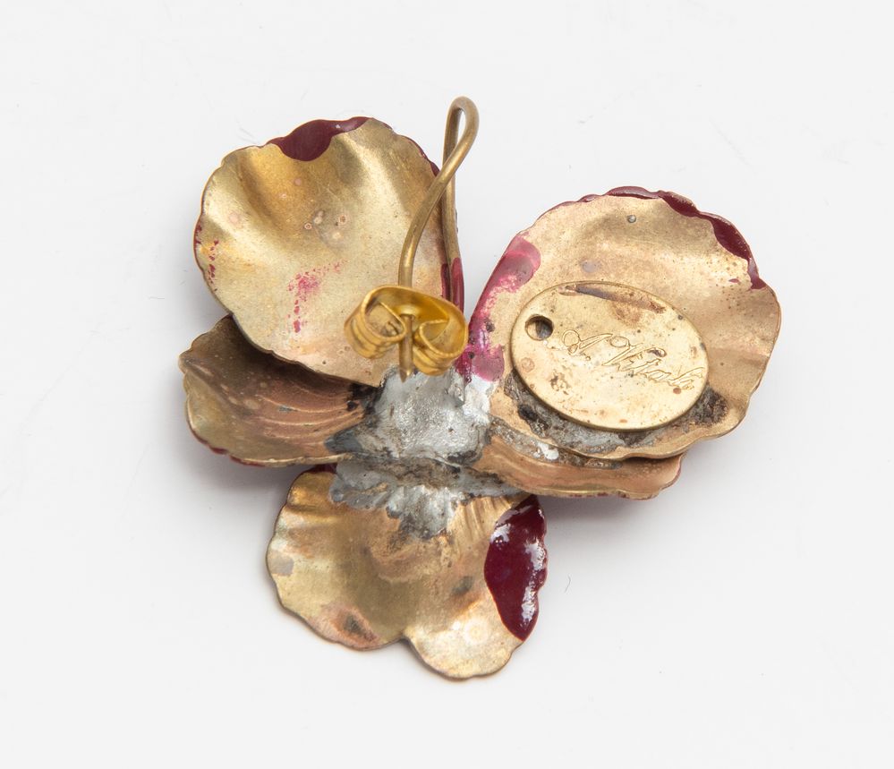 ANNARITA VITALI Orecchini pensees. Petali in ottone saldati e smaltati a freddo. Recano targhetta con firma dell' autrice. Pubblicasioni: Rivista Elle Shopping.