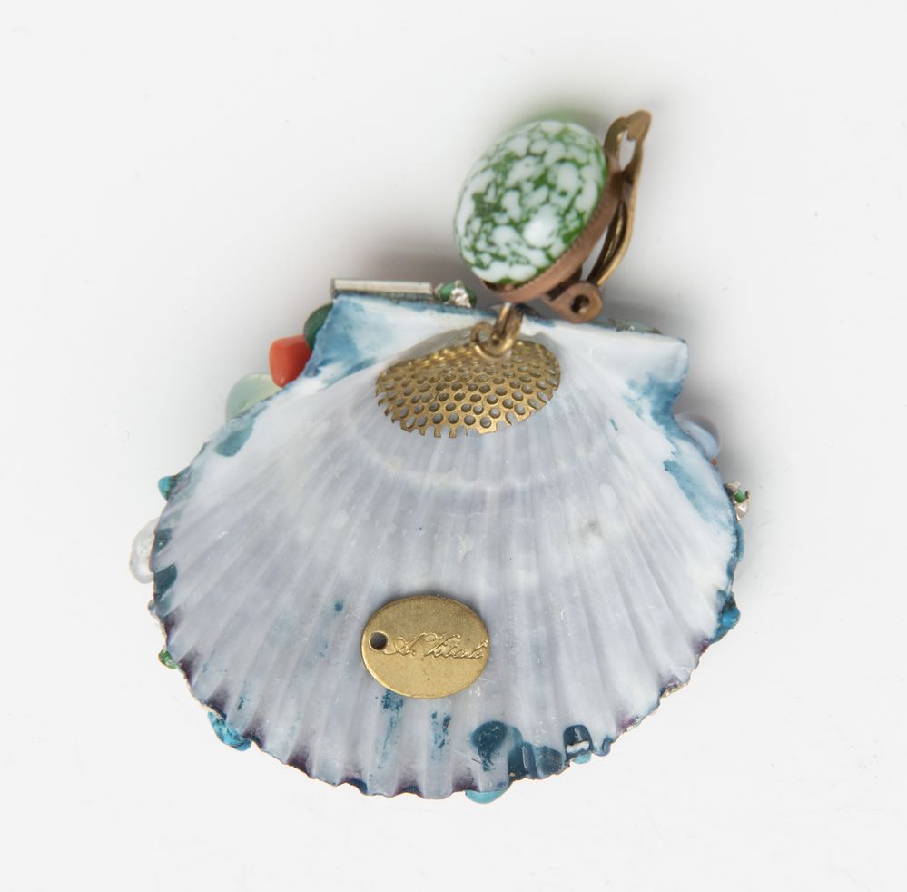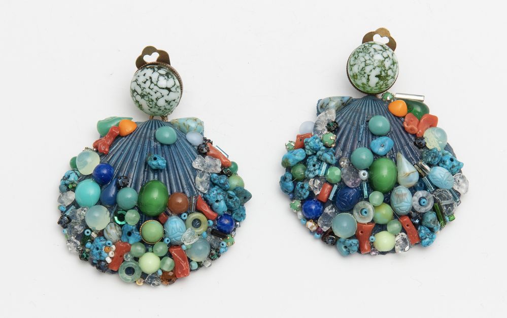 ANNARITA VITALI Orecchini a clips con conchiglie decorate da avventurine veneziane e materiali d’epoca. Dalla collezione 2004 ispirate a Fulco di Verdura. Anni '50. Cm 6 cad. Recano targhetta con firma dell' autrice.