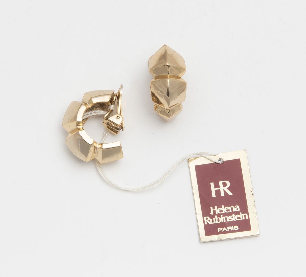 HELENA RUBINSTEIN Orecchini a clips ad anella dorati. Anni '80. Recano...
