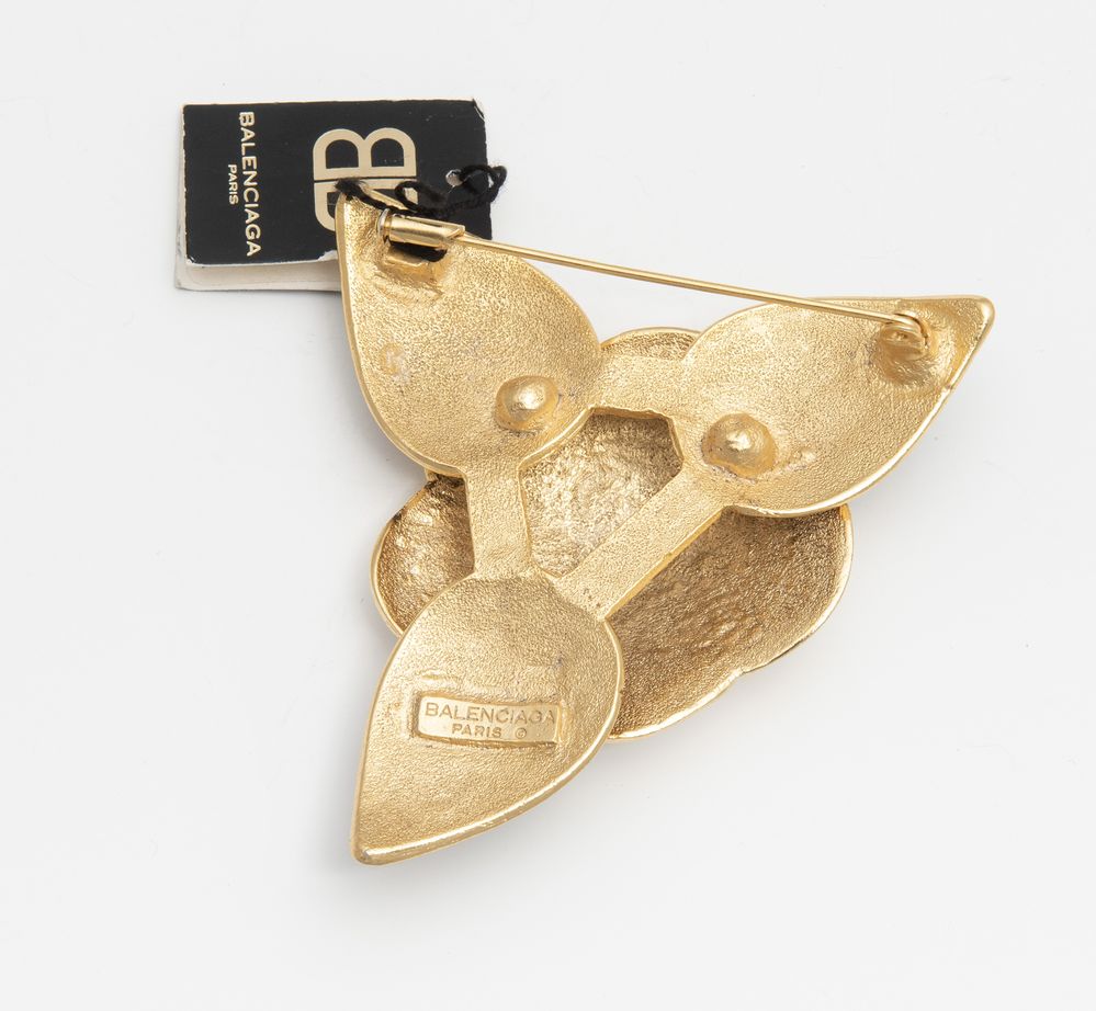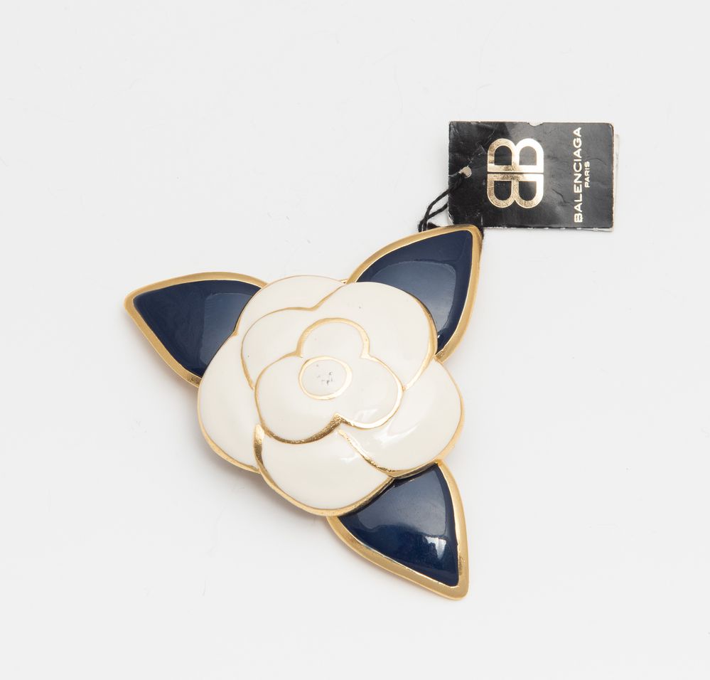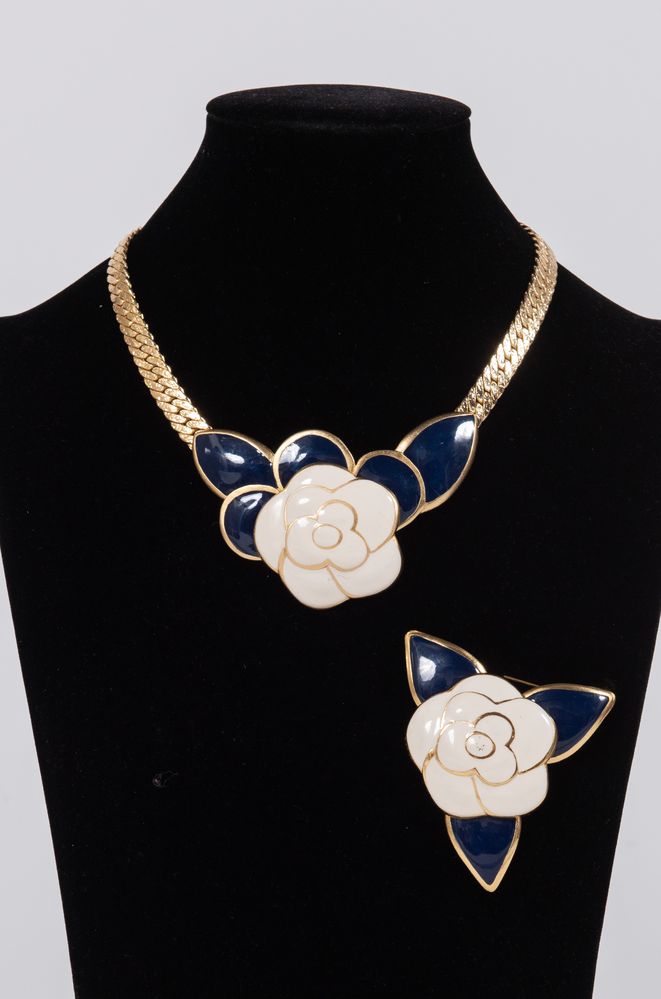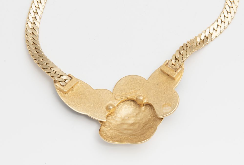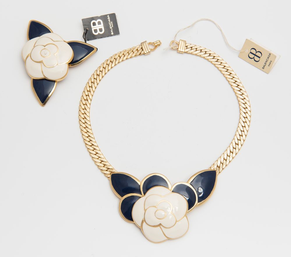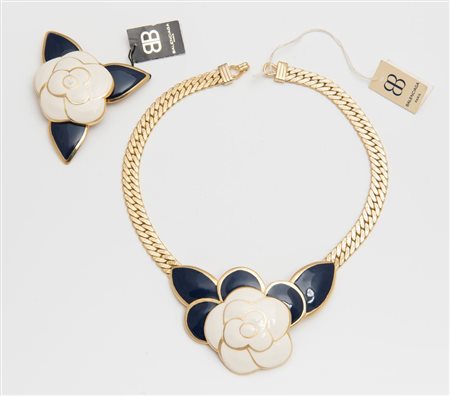 BALENCIAGA Parure composta da collier e spilla con peonia smaltata a fuoco. Anni '80 / '90. Reca marchio a fuoco della maison ed etichetta originale.