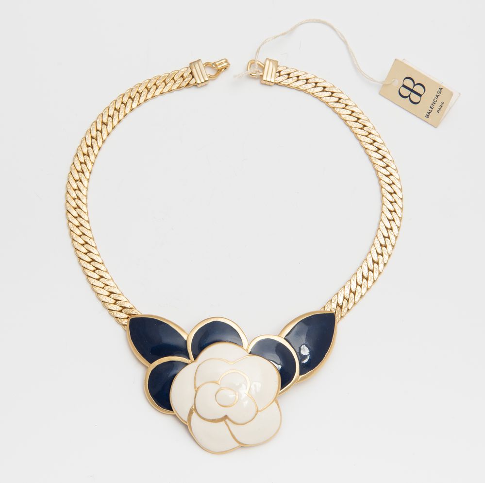 BALENCIAGA Parure composta da collier e spilla con peonia smaltata a fuoco....