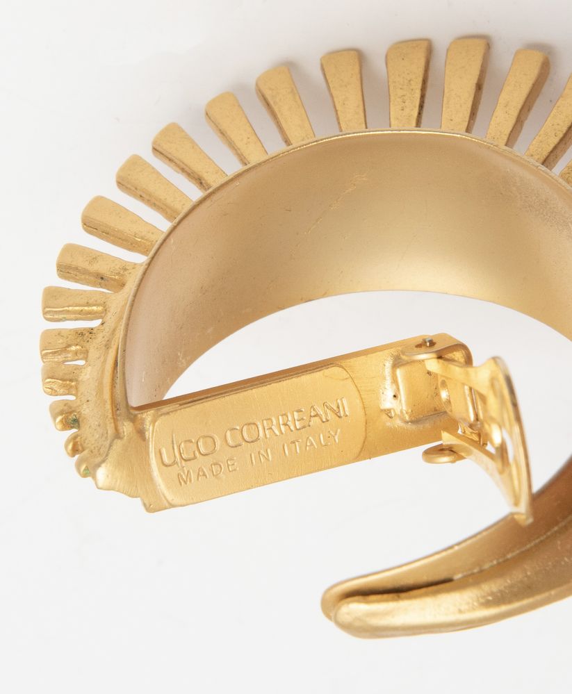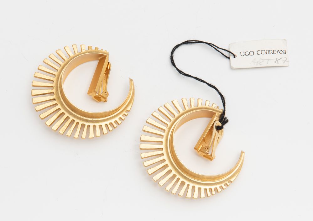 UGO CORREANI Orecchini a clips dorati, dalla collezione "Ingranaggi". Anni '80. Recano marchio a fuoco della maison ed etichetta originale,