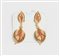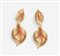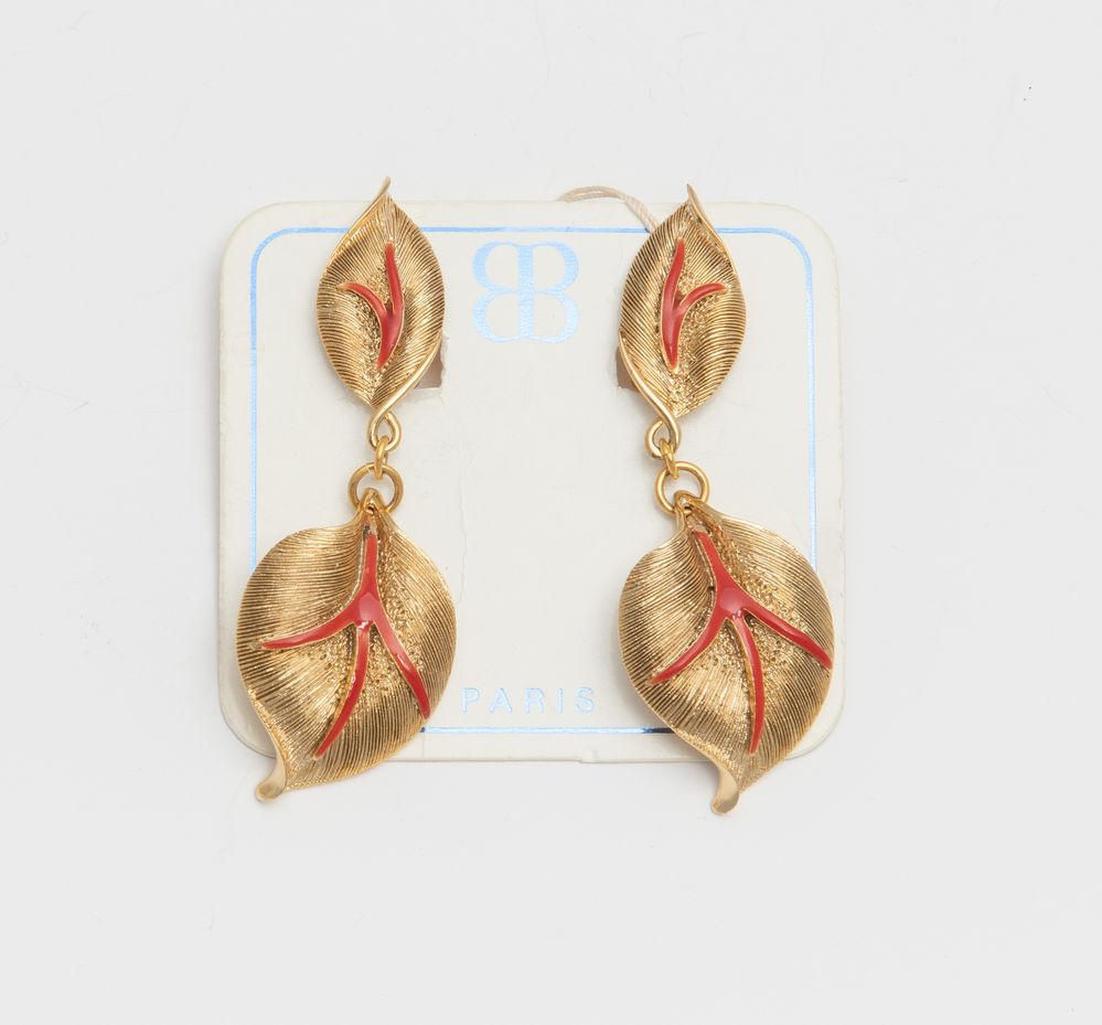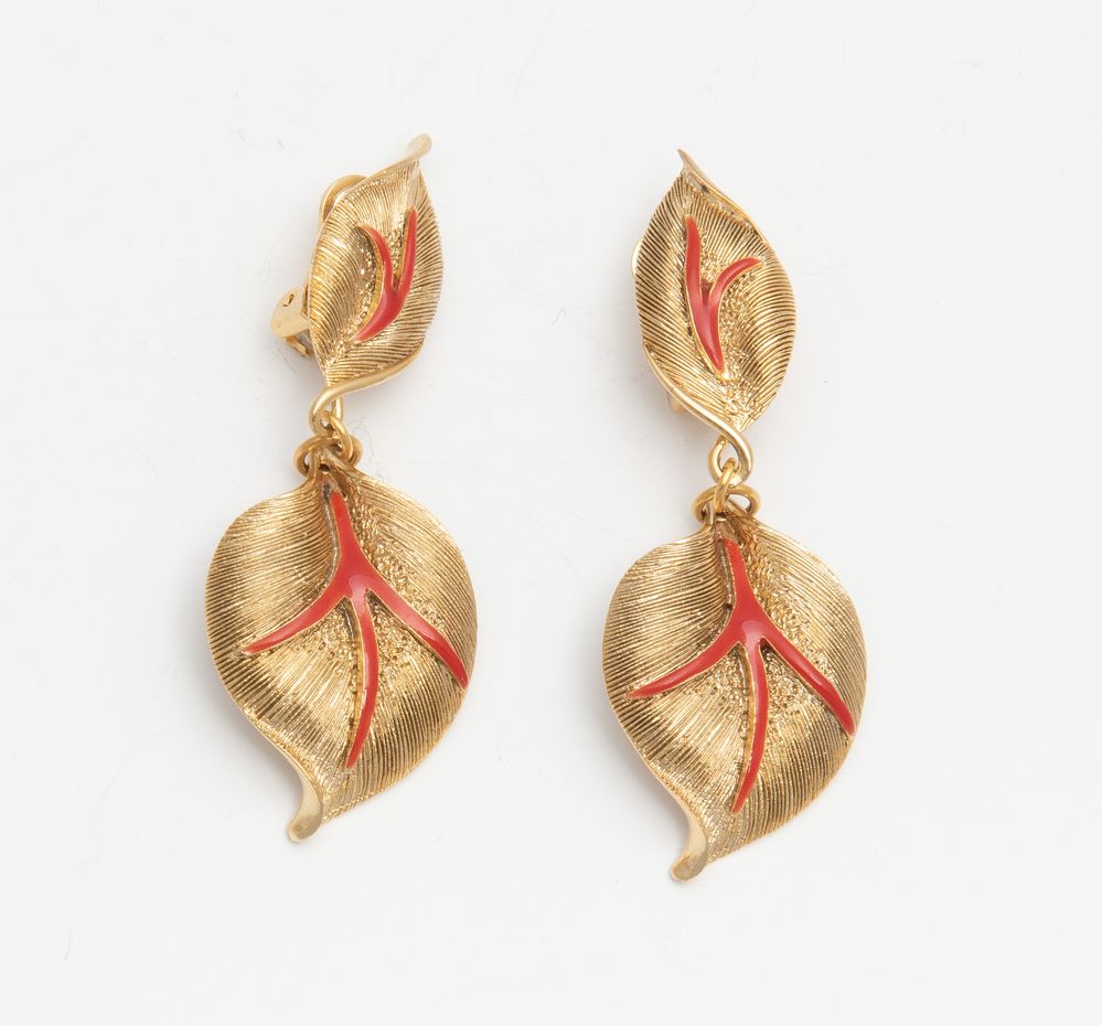 BALENCIAGA Orecchini a clips dorati con doppie foglie e inserti in rilievo in smalto rosso. Cm 6,5 cad. Recano marchio a fuoco della maison e cartellino originale