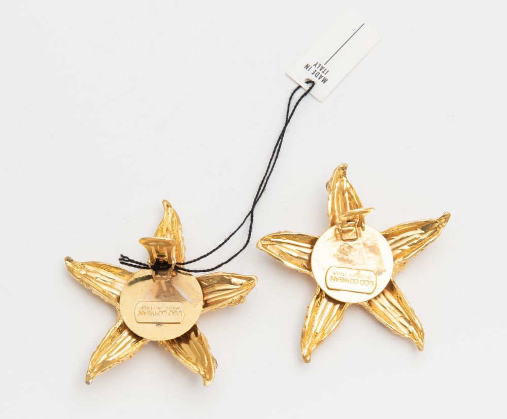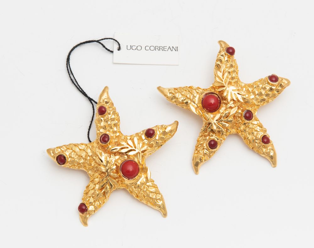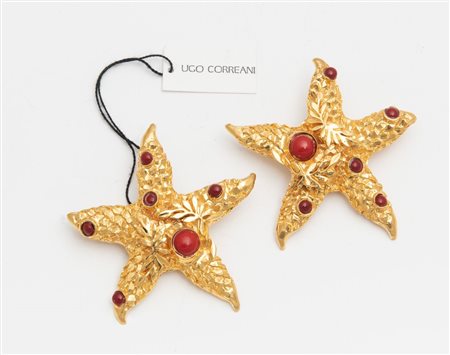 UGO CORREANI Orecchini a clips dorati con stella marina. Decorati con cabochon vitrei color corallo. Anni '80. Cm 6 cad. Recano marchio a fuoco della maison ed etichetta originale.