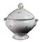 in porcellana bianca decorata a motivi floreali, coperchio con presa a melograna, bordi e profili con filo oro, difetti
