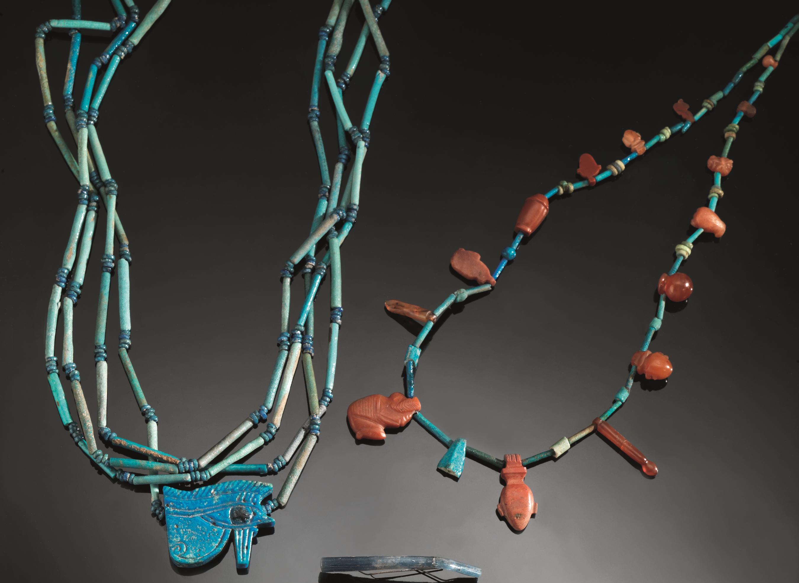 Una collana in faience con occhio udjat e una collana in faience con pendenti...