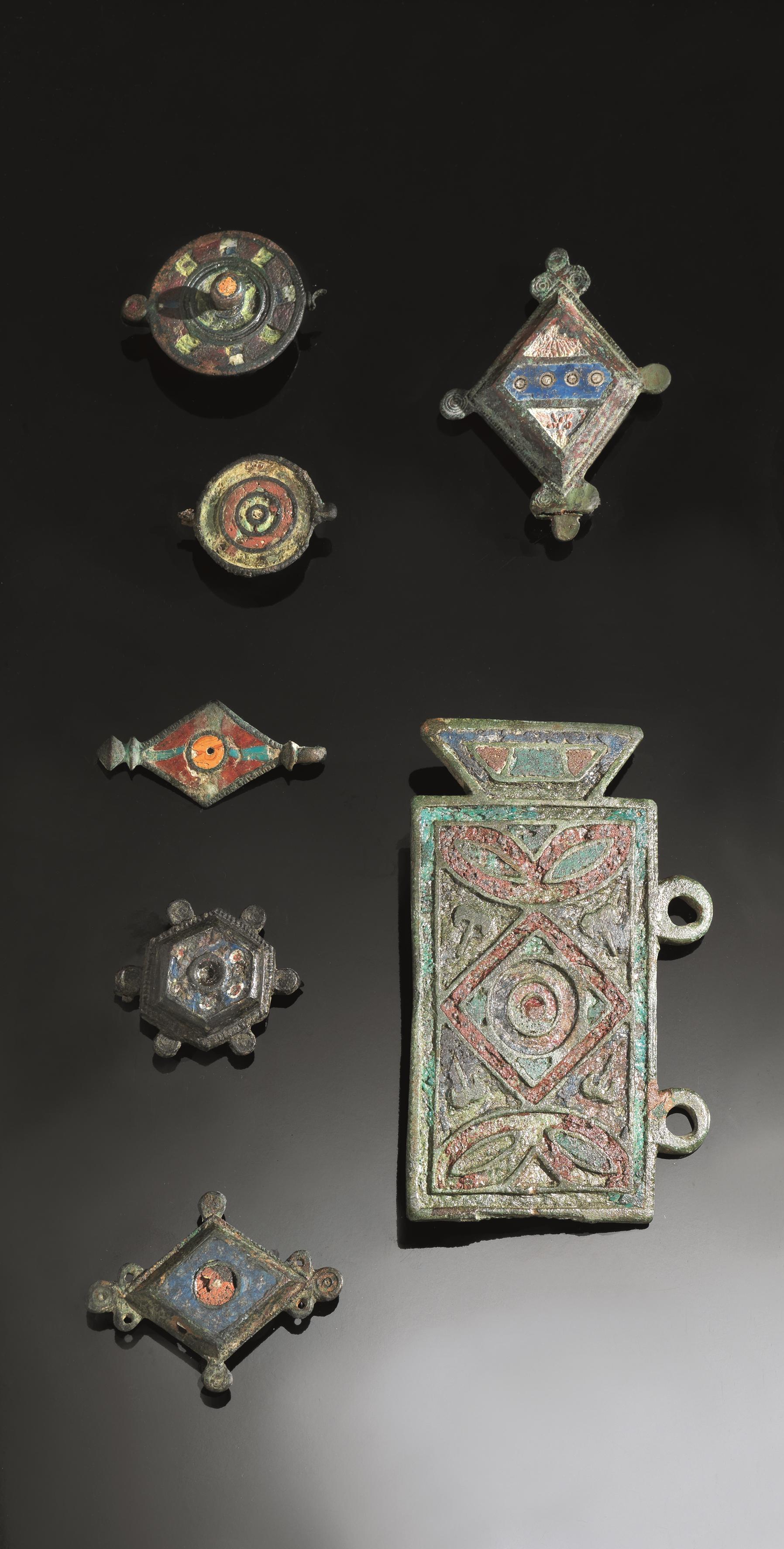 Una grande fibula rettangolare con appendice triangolare e due anelli su un lato; una piccola fibula esagonale con appendici circolari e bordo a cordicella; tre fibule romboidali con appendici lobate; un pendente romboidale; una fibula circolare ed una fibula circolare con bottone in rilievo al centro; tutte decorate a champlevé di smalti policromi con motivi geometrici (7)