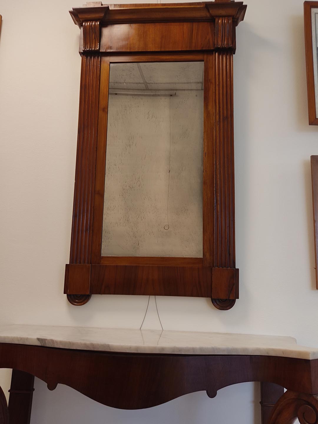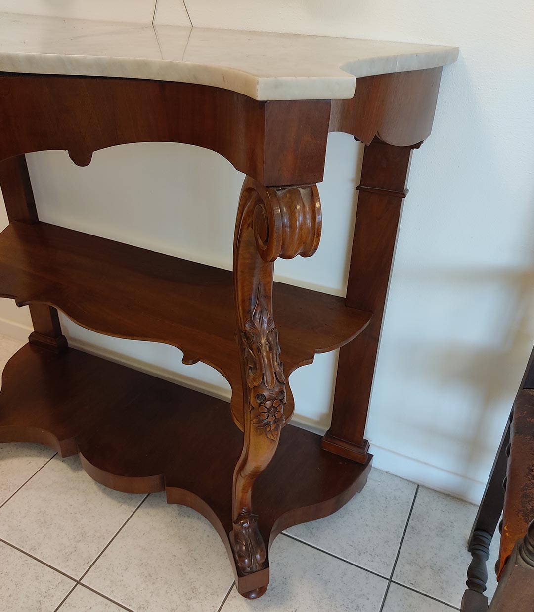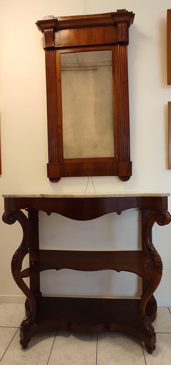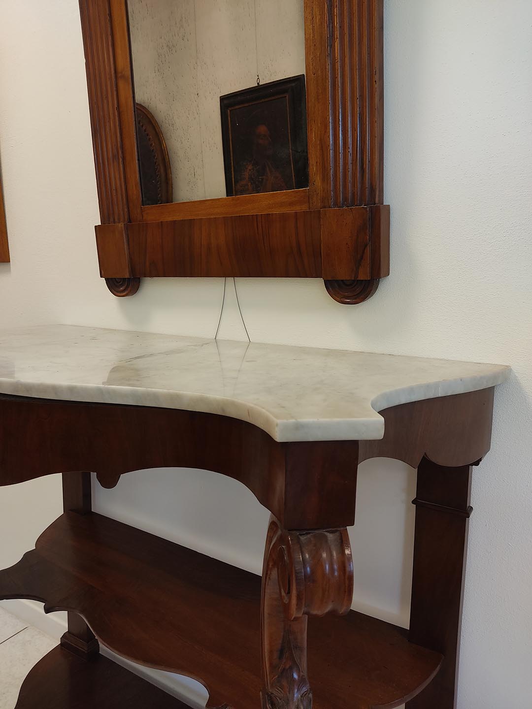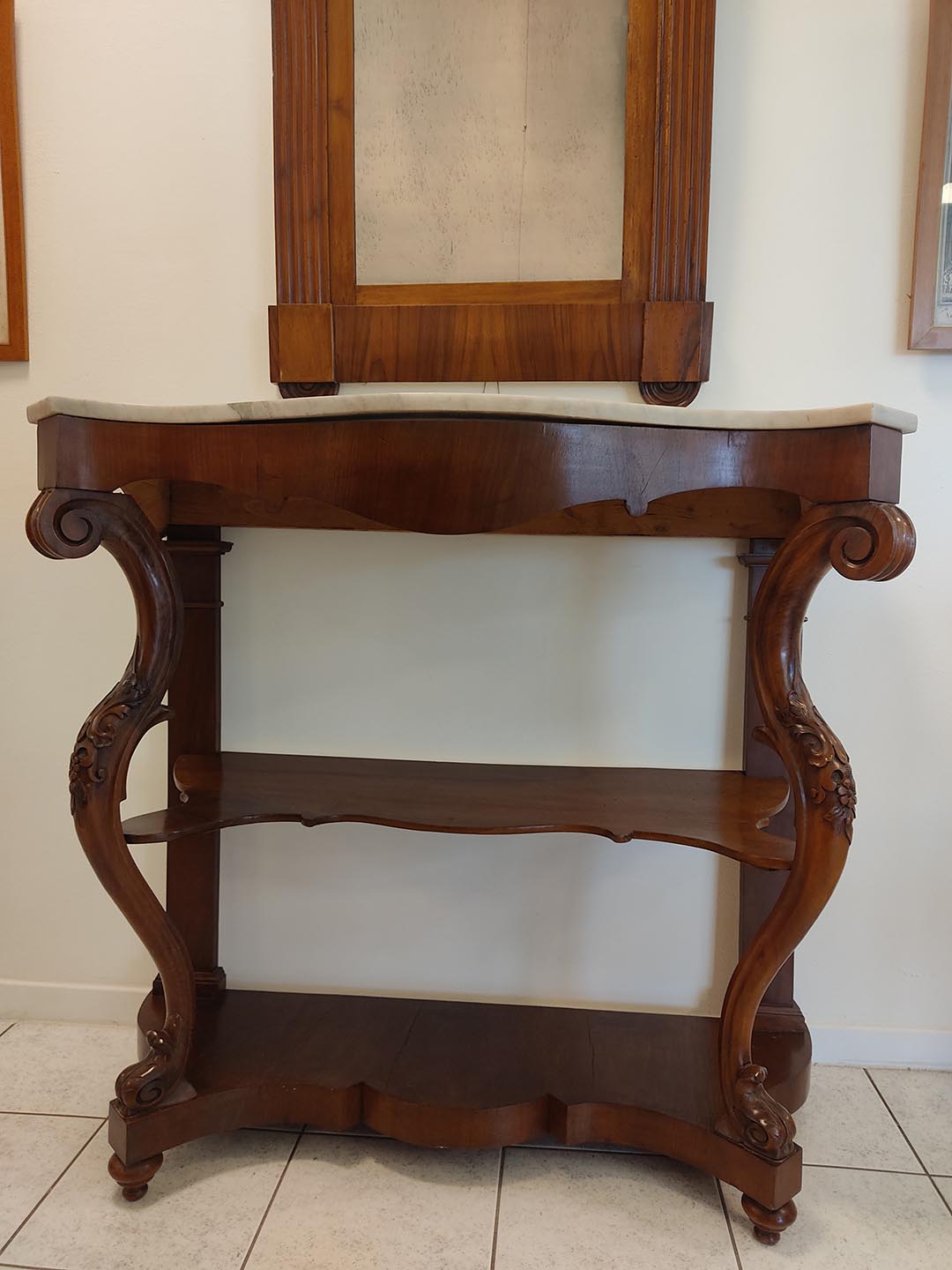 in noce scolpito ed intagliato, piano in marmo bianco, gambe a voluta e due sottopiani sagomati; specchiera sovrastante rettangolare, con lesene laterali scanalate, vetro a mercurio