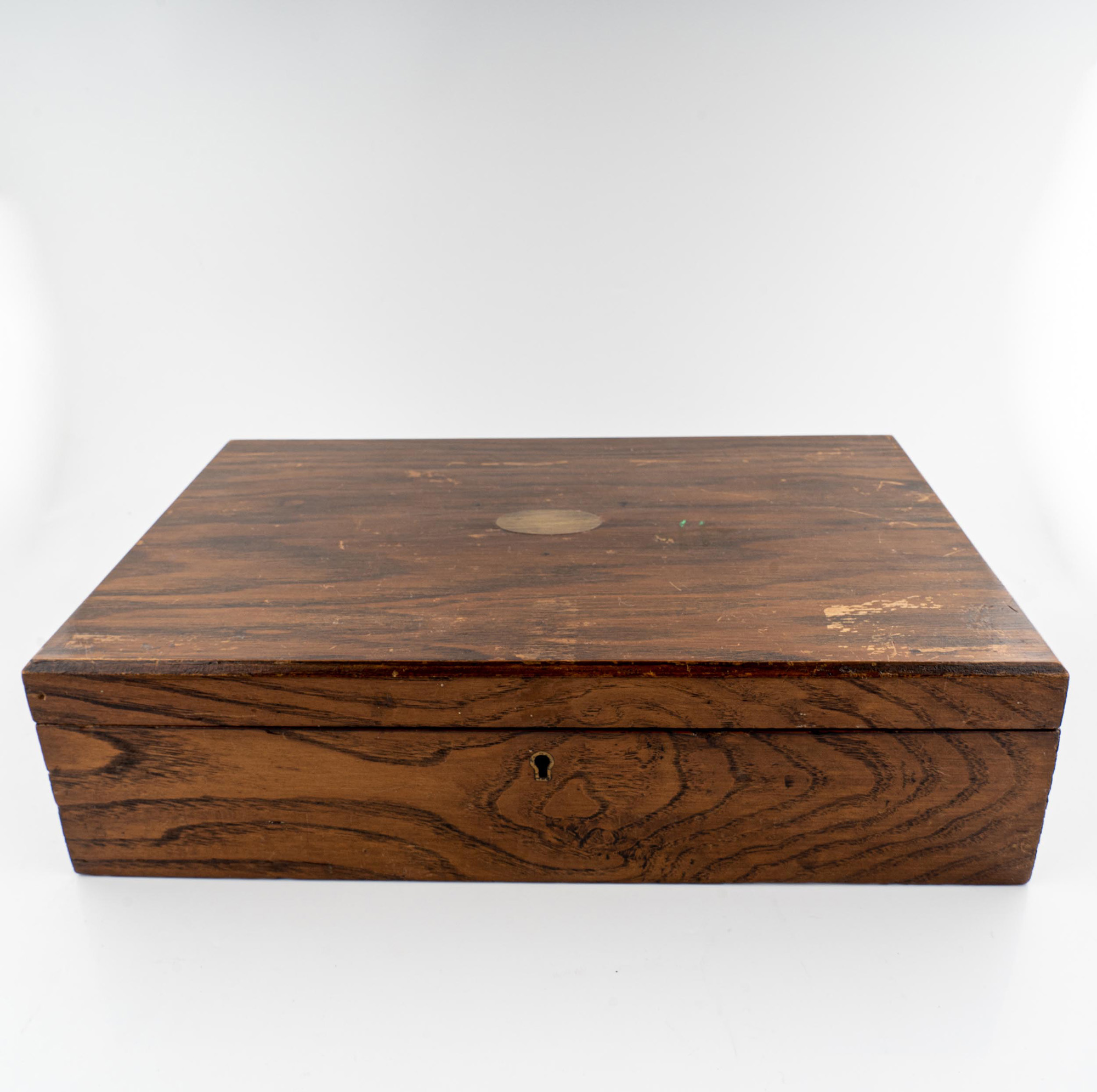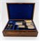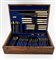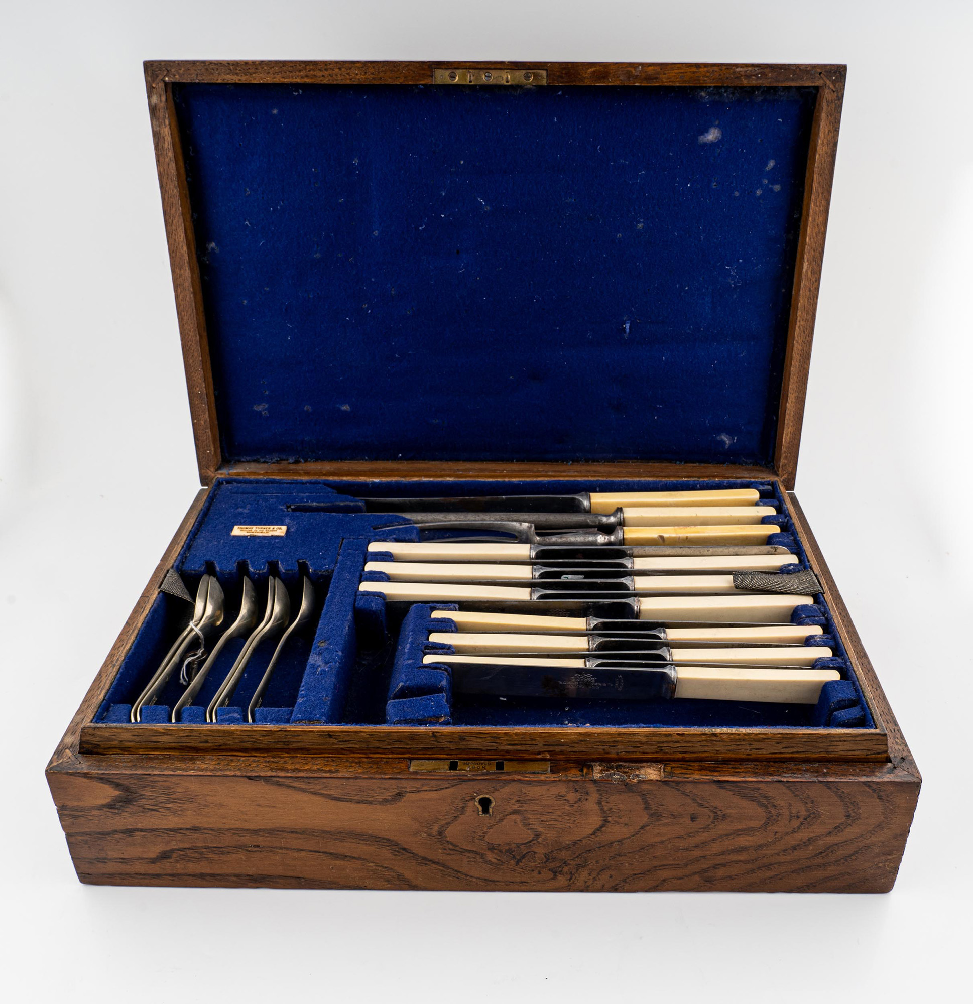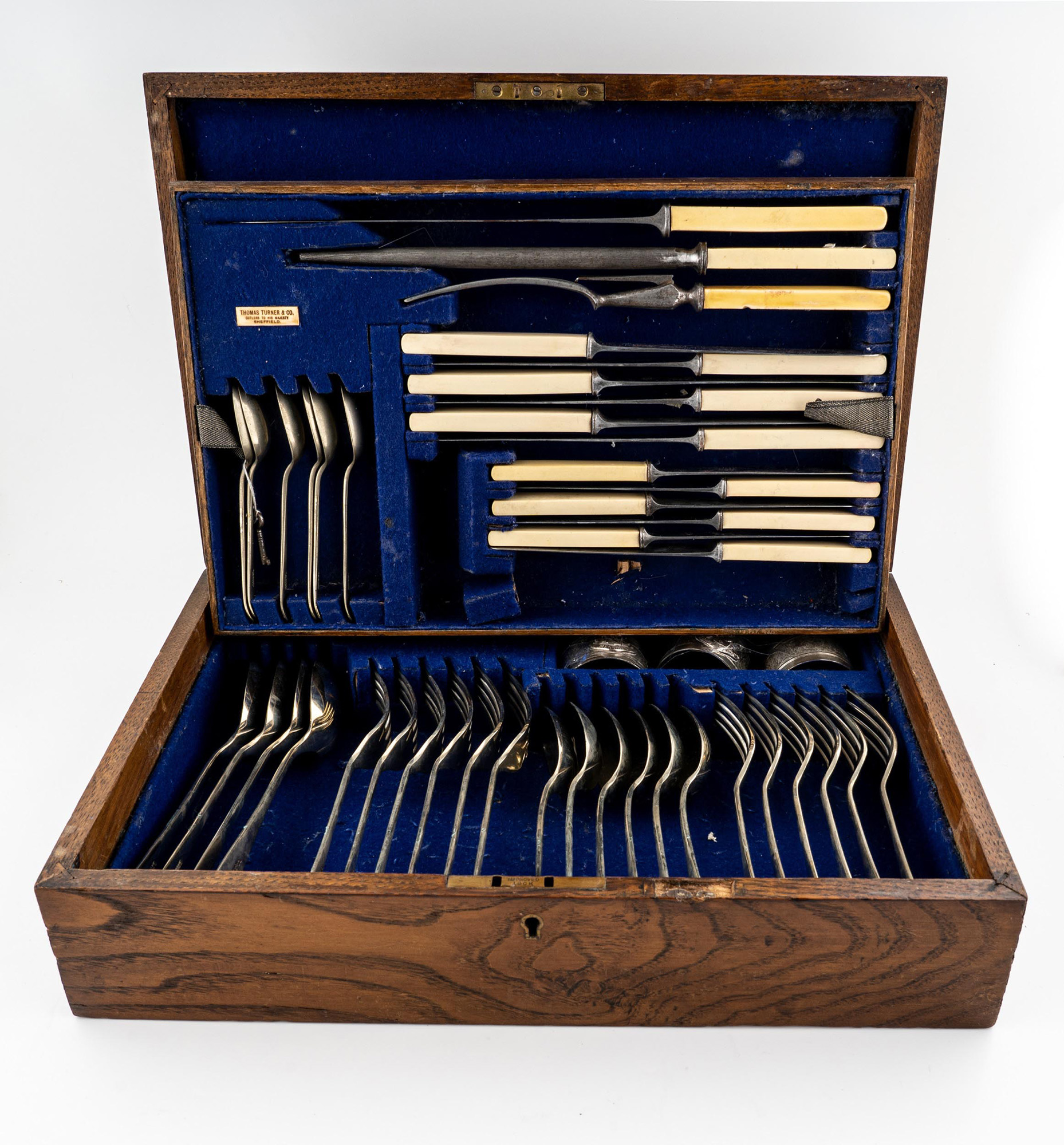 in mogano, marcata Thomas Turner & Co. Sheffield contenente, due vassoi con coltello, forchettone e acciarolo da arrosto, 4 forchette e 4 coltelli da pietanza, 4 cucchiai da minestra, 4 da dessert e 6 da caffè, 4 forchette e 4 coltelli da frutta, tutti con manici in avoriolina e tre portatovaglioli in metallo argentato