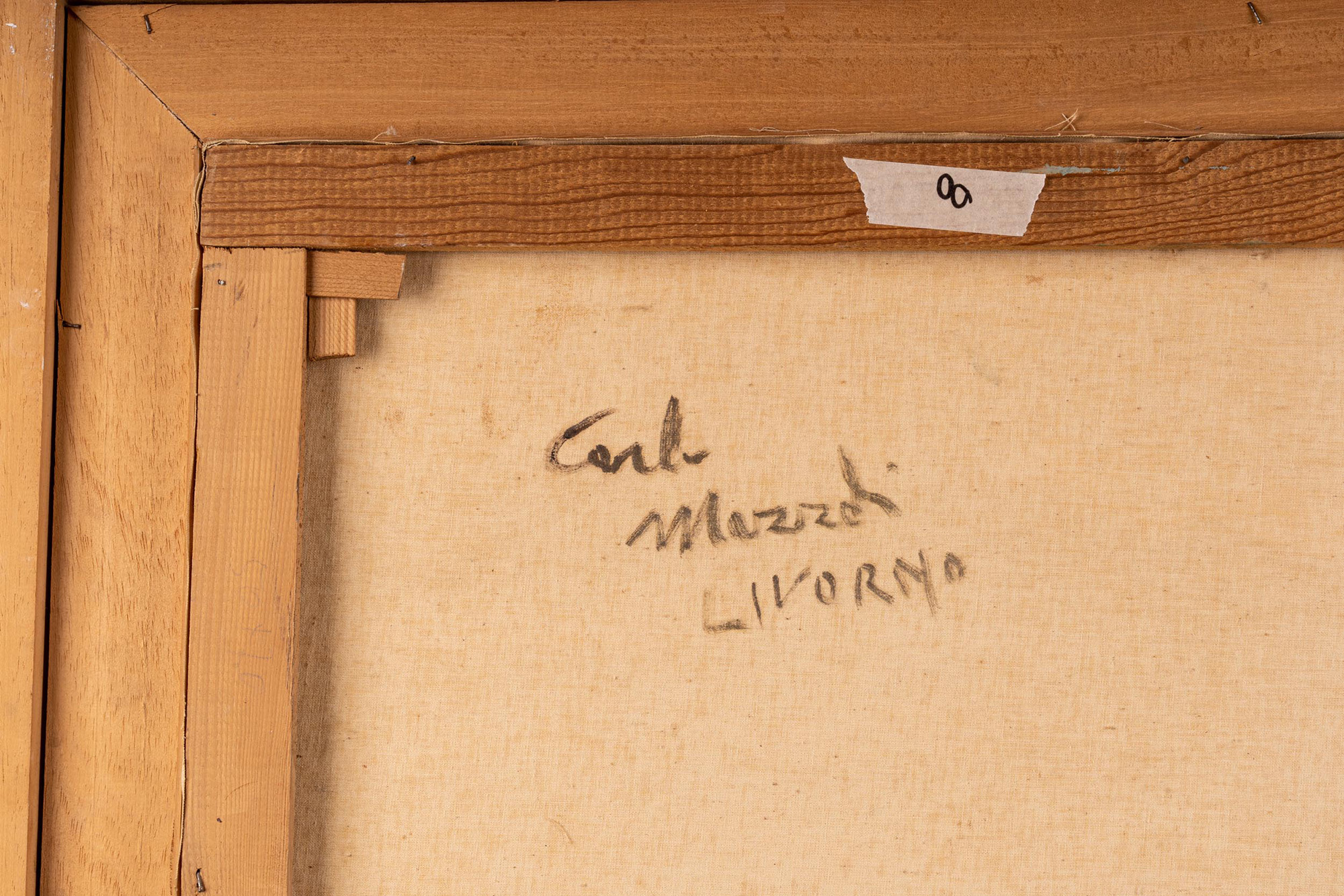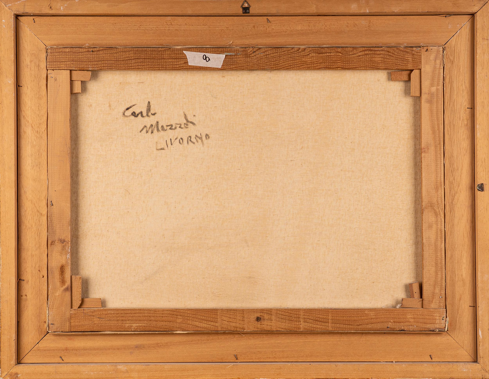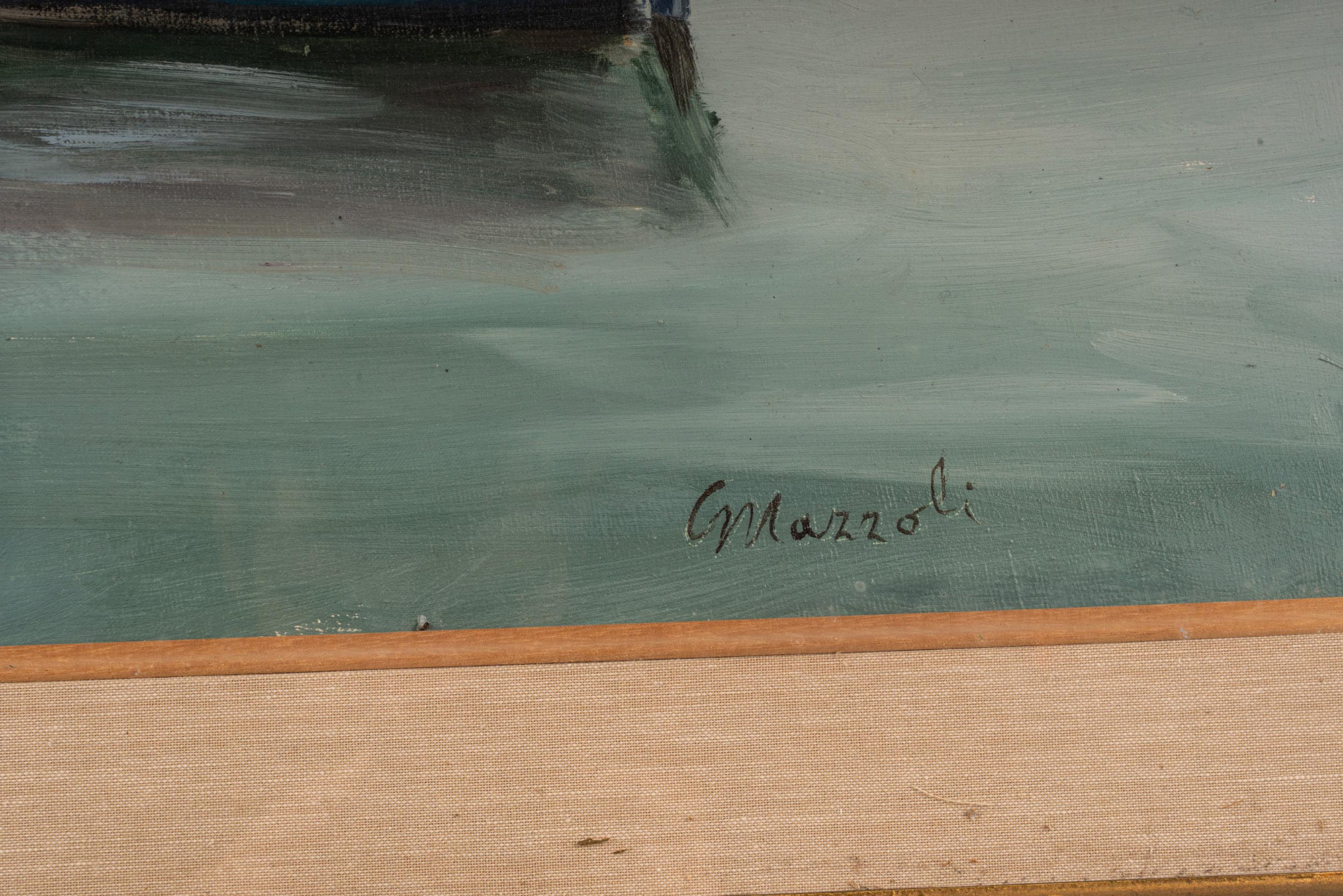 Carlo Mazzoli, Veduta costiera con barche, dipinto ad olio su tela, entro cornice, firmato fronte e retro