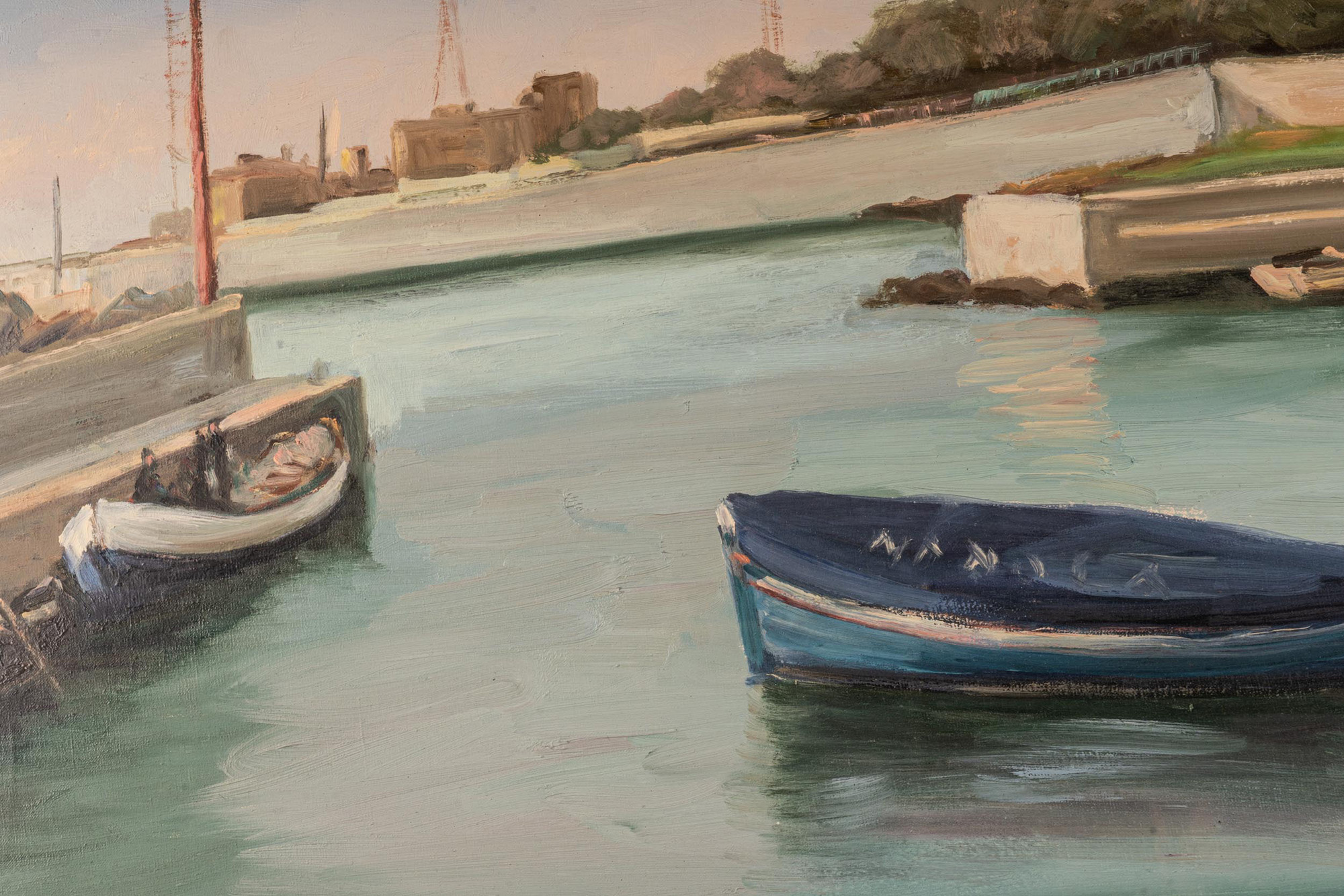 Veduta costiera con barche, dipinto ad olio su tela, entro cornice, firmato fronte e retro