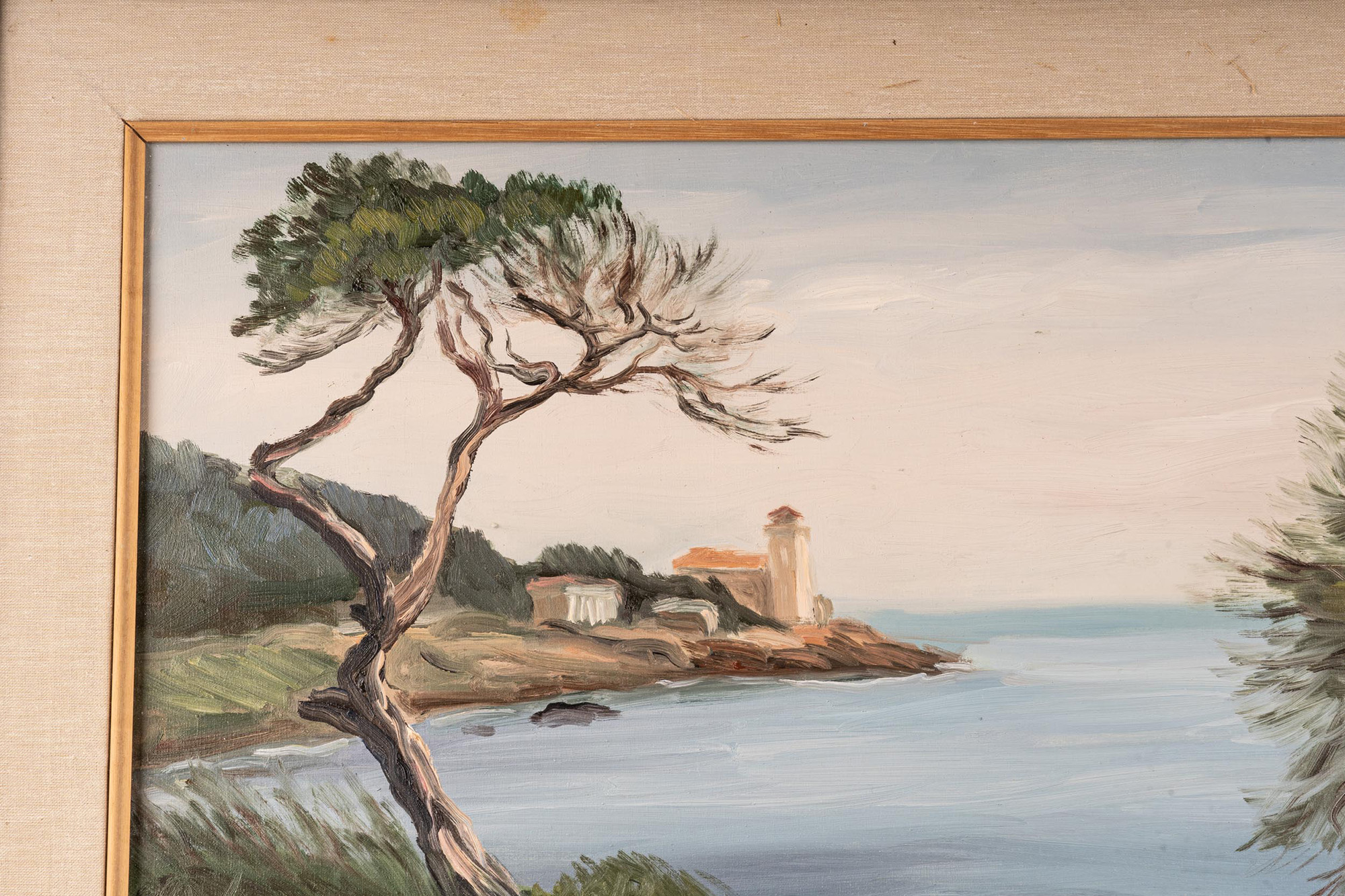 Veduta costiera, dipinto ad olio su tela, entro cornice, firmato fronte e retro, Livorno