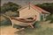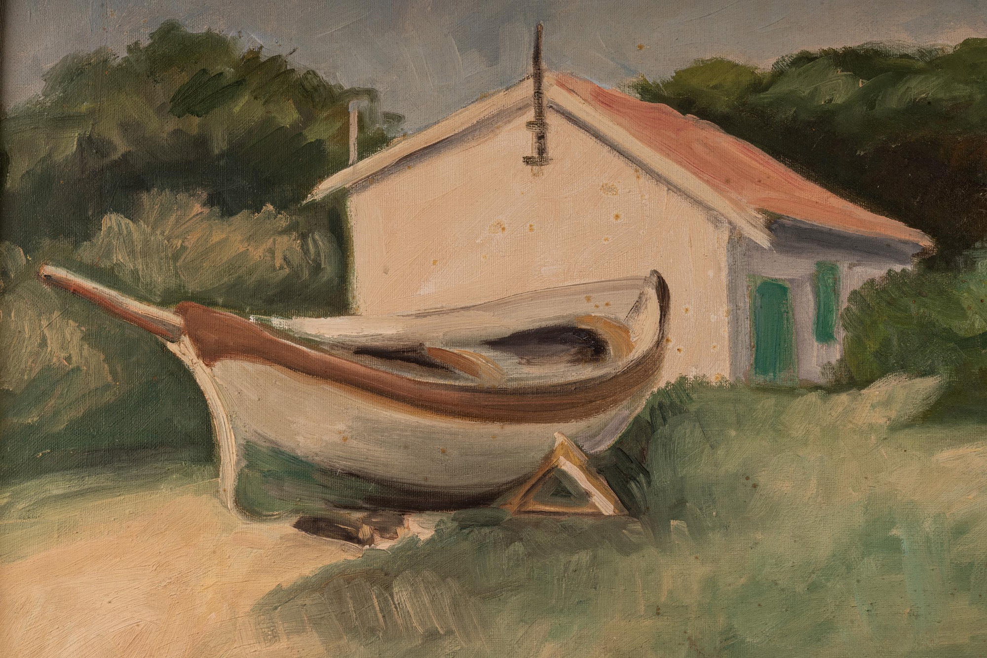 Paesaggio con barca e casa, dipinto ad olio su tela, entro cornice, firmato in basso a destra