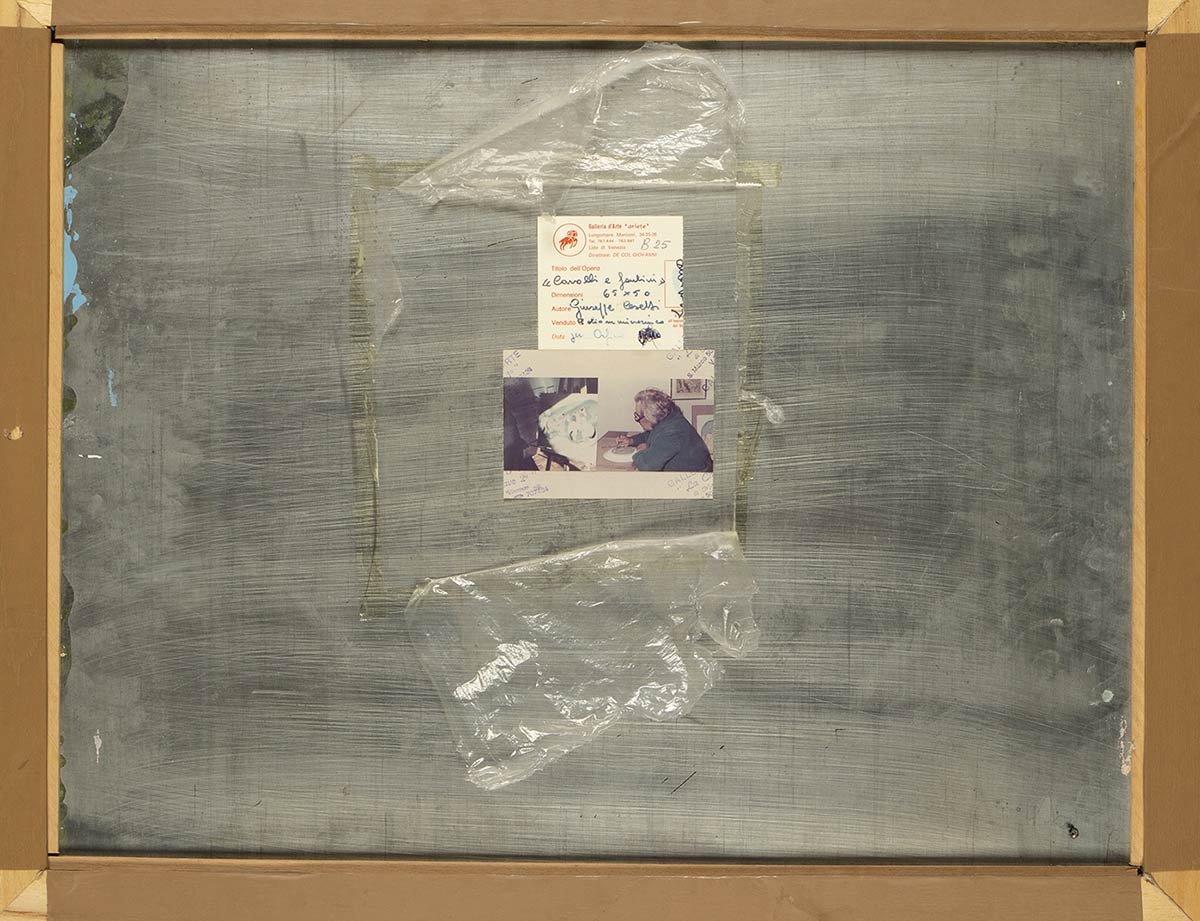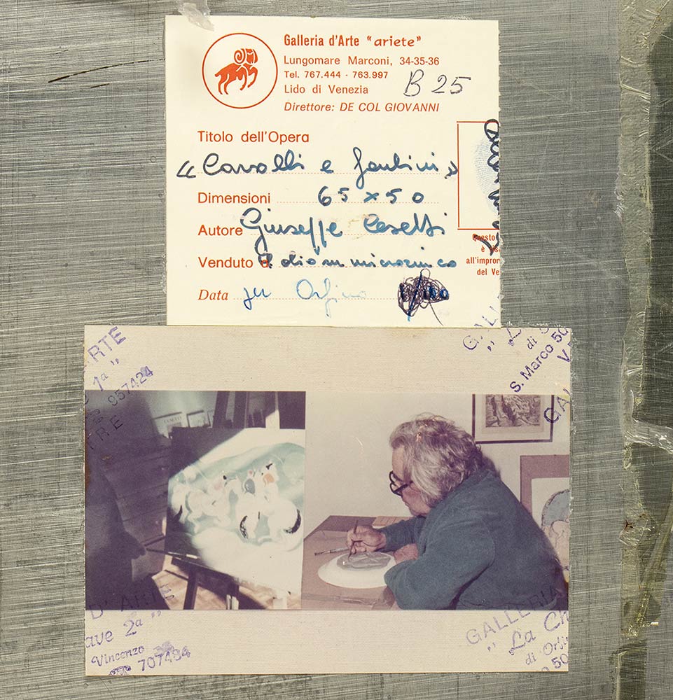 Firmato in basso a sinistra, al retro etichetta della Galleria d'Arte Ariete di Venezia e una foto dell'artista mentre dipinge l'opera