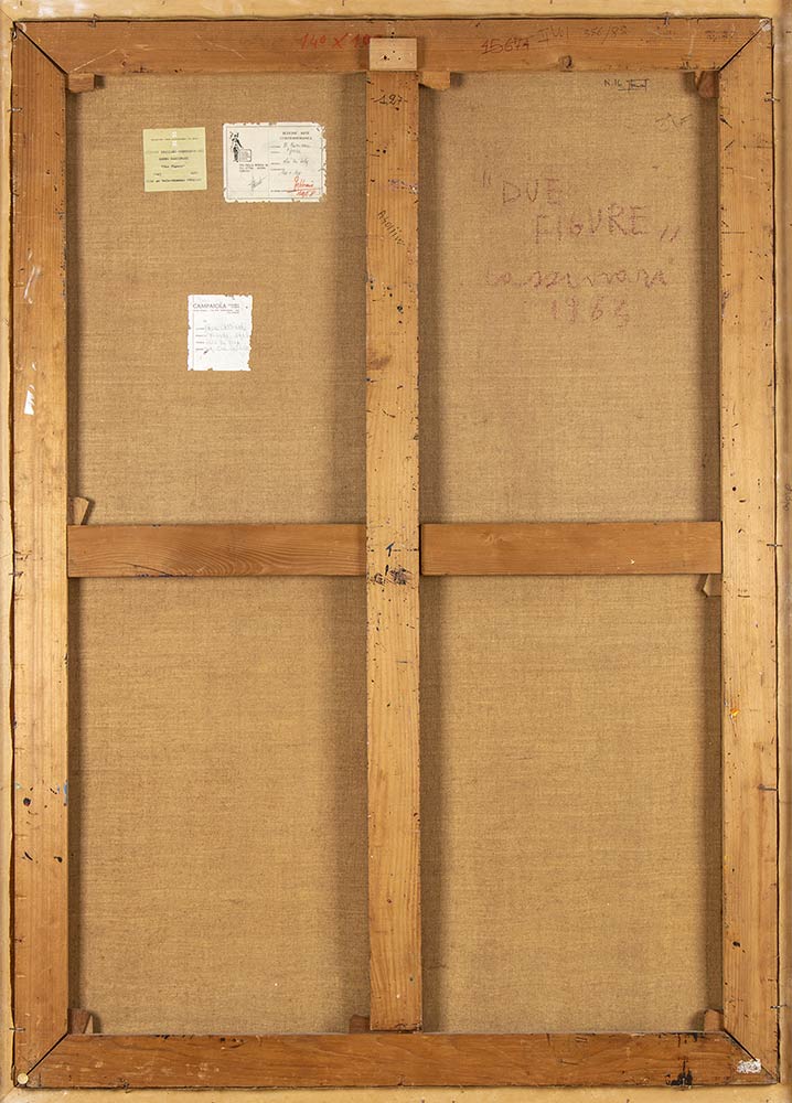 Firmato e datato in basso a destra "Cassinari ‘63". Sul retro titolato, firmato e datato "Due Figure, Cassinari, 1963". Numerose etichette tra cui: etichetta della galleria d’arte Campaiola di Roma; etichetta della galleria d’arte Gissi di Torino; etichetta della Nuova Codebò galleria d’arte di Torino sez. arte contemporanea del febbraio 1968;