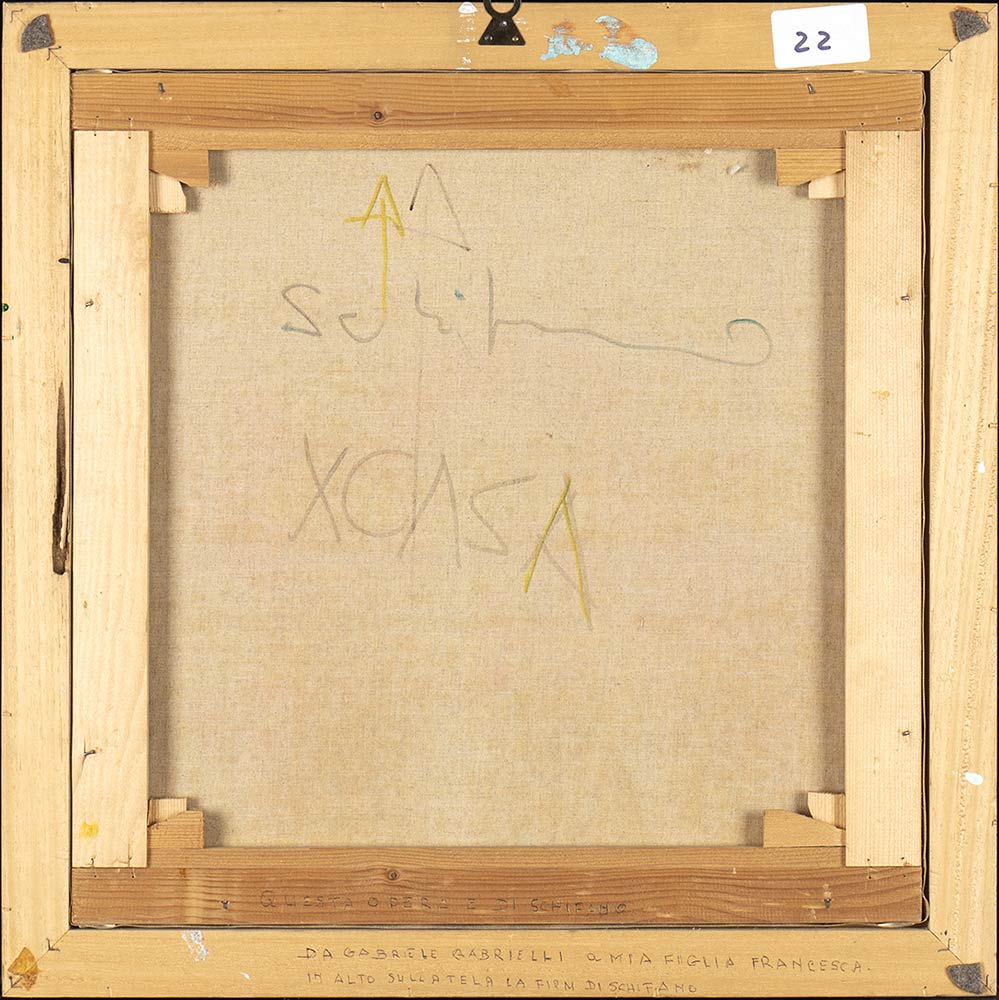 Al retro firma e titolo "Schifano, Casa"; in basso sul telaio “Questa opera è di Schifano da Gabiele Gabrielli a mia figlia Francesca in alto sulla tela la firma di Schifano”