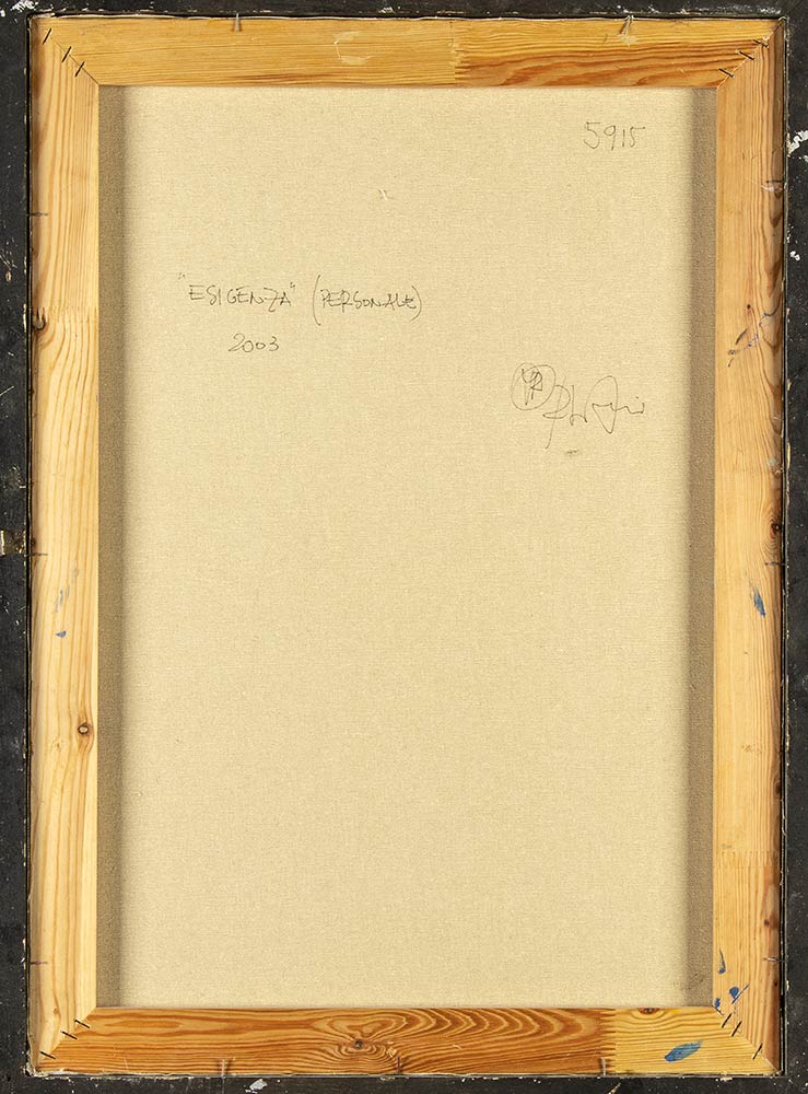 Titolo, anno e firma al retro "Roberto Miniati, Esigenza (Personale), 2003"