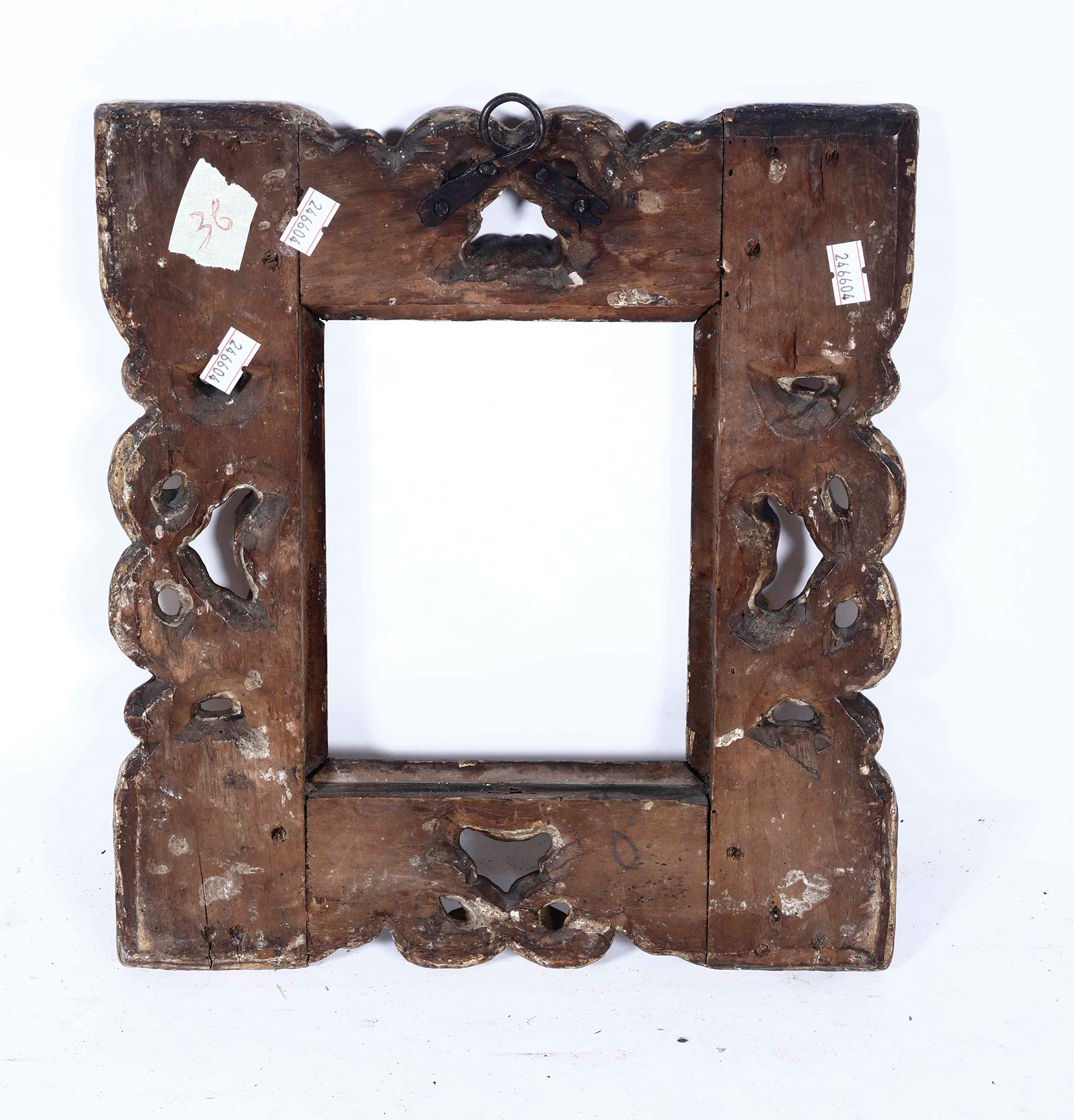 Cornice in legno intagliato e dorato. Toscana XVII secolo, battuta liscia contornata da fascia intagliata con motivi di foglie, cm 31x28 luce cm 16x12,5