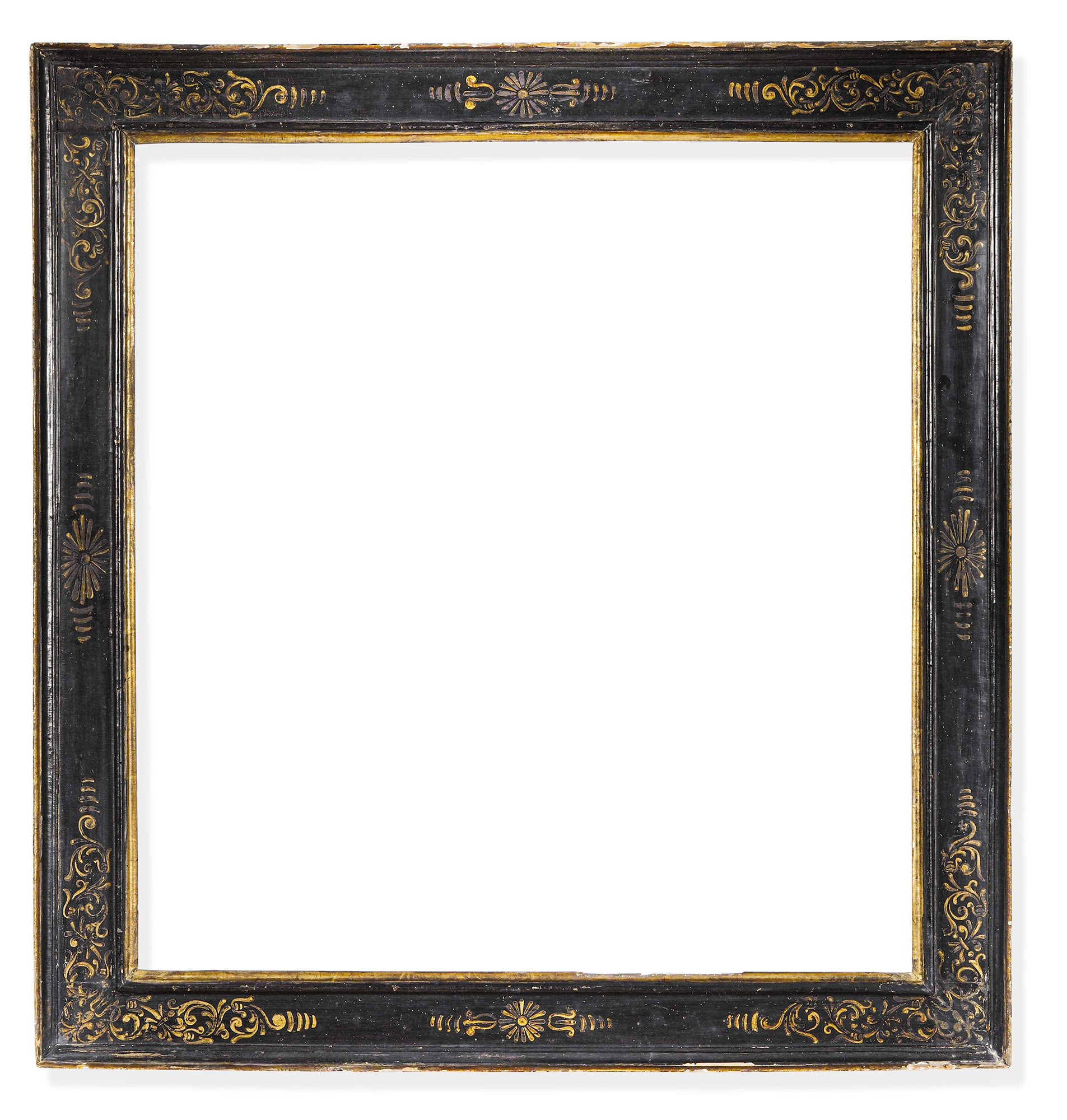 Cornice a cassetta in legno ebanizzato e dorato. Toscana XVI secolo, cm 105x111 luce cm 84x88 battuta cm 87x93