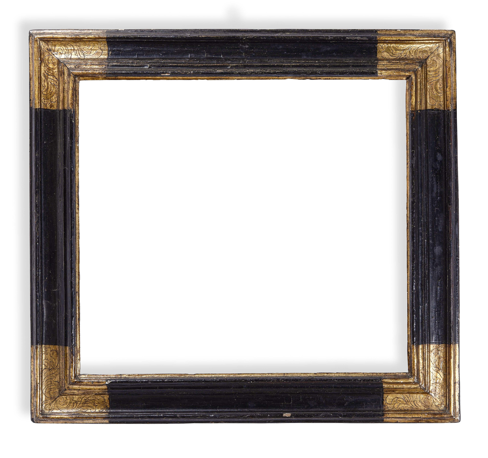 Cornice in legno ebanizzato e angoli dorati e bulinati. Toscana XVII secolo, cm 102x110 luce cm 75x83 battuta cm 80x87