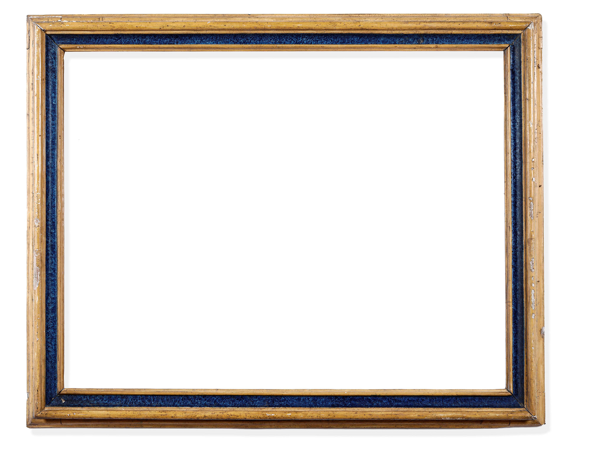 Cornice di sagoma Salvator Rosa in legno laccato azzurro e giallo. Centro Italia XVII secolo, cm 116x93 luce cm 98,5x75,5 battuta cm 100,5x77