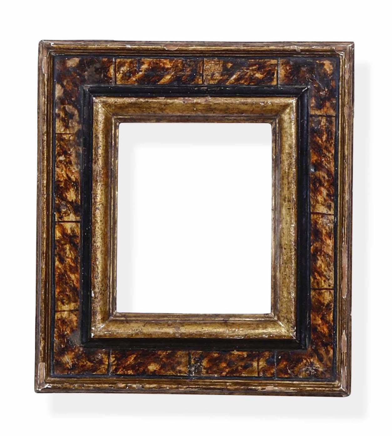 Cornice a cassetta in legno dipinto, ebanizzato e dorato. Italia centrale XVI secolo, cm 39,5x35 luce cm 21x16,7