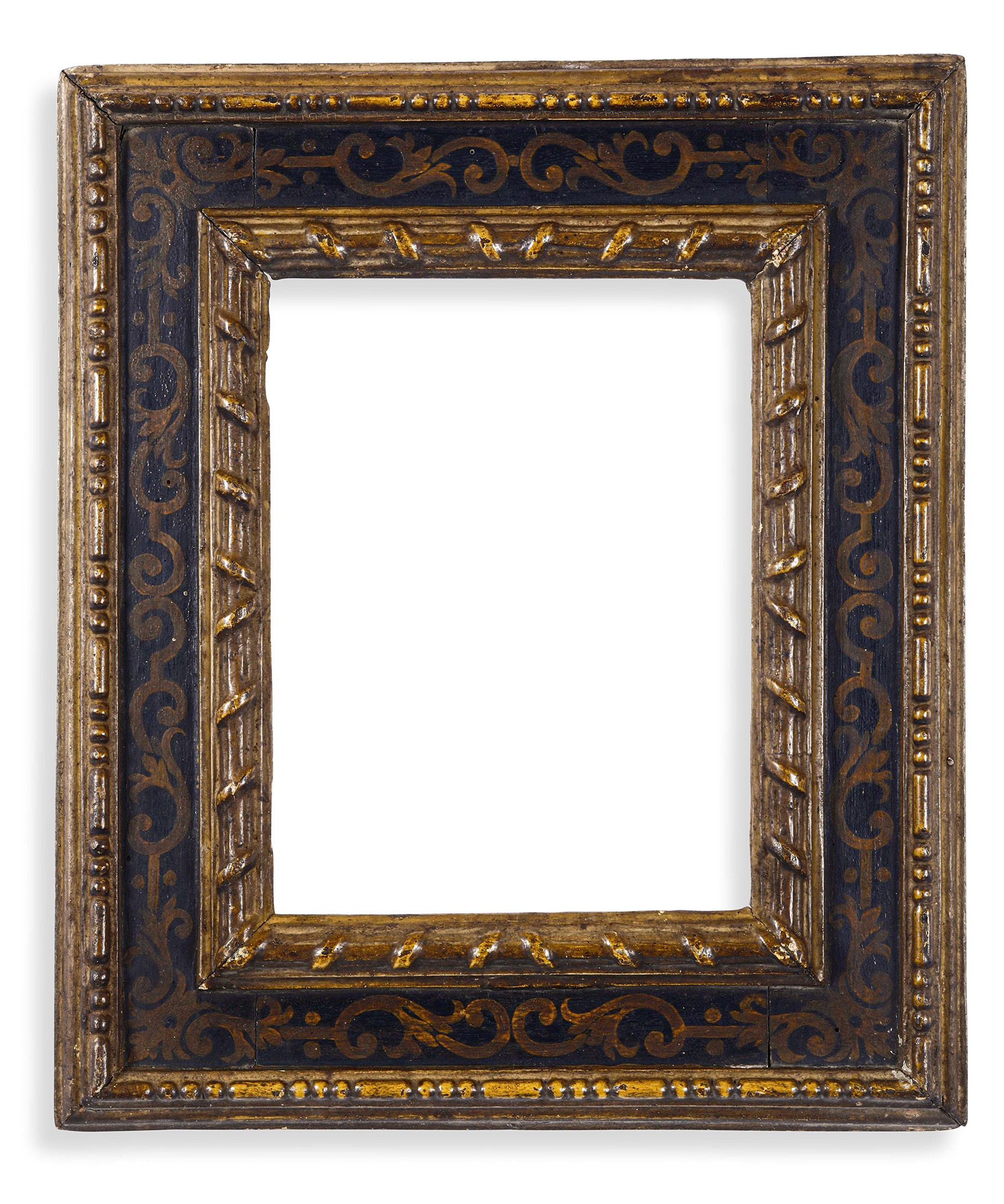 Cornice a cassetta in legno ebanizzato e dipinto a racemi, Italia centrale XVI secolo, luce cm 30x22,7, esterno cm 51x43,5