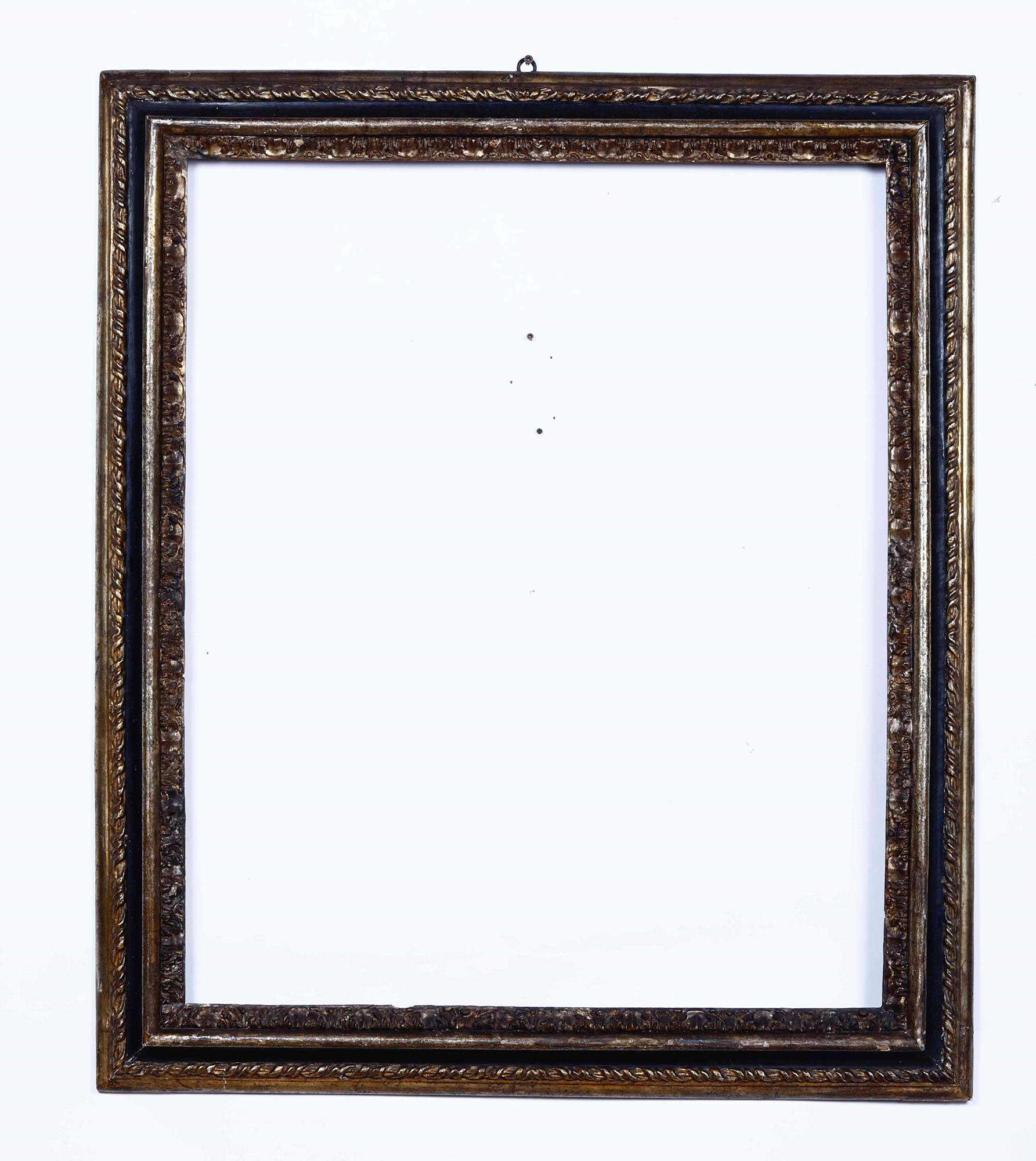 Cornice in legno intagliato, dorato a mecca ed ebanizzato. Centro Italia XVIII secolo, cm 93x108 luce cm 74x88 battuta cm 78x93