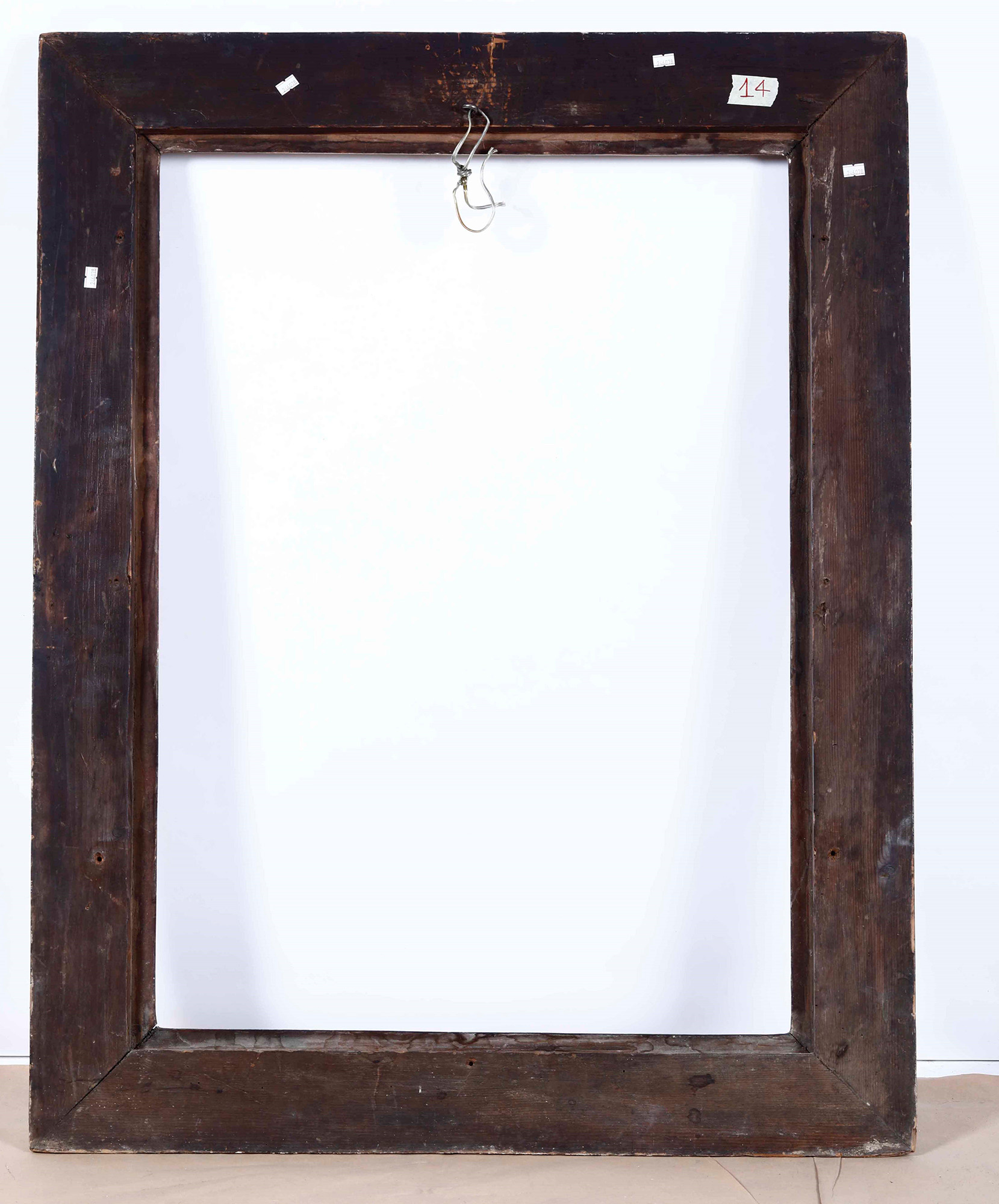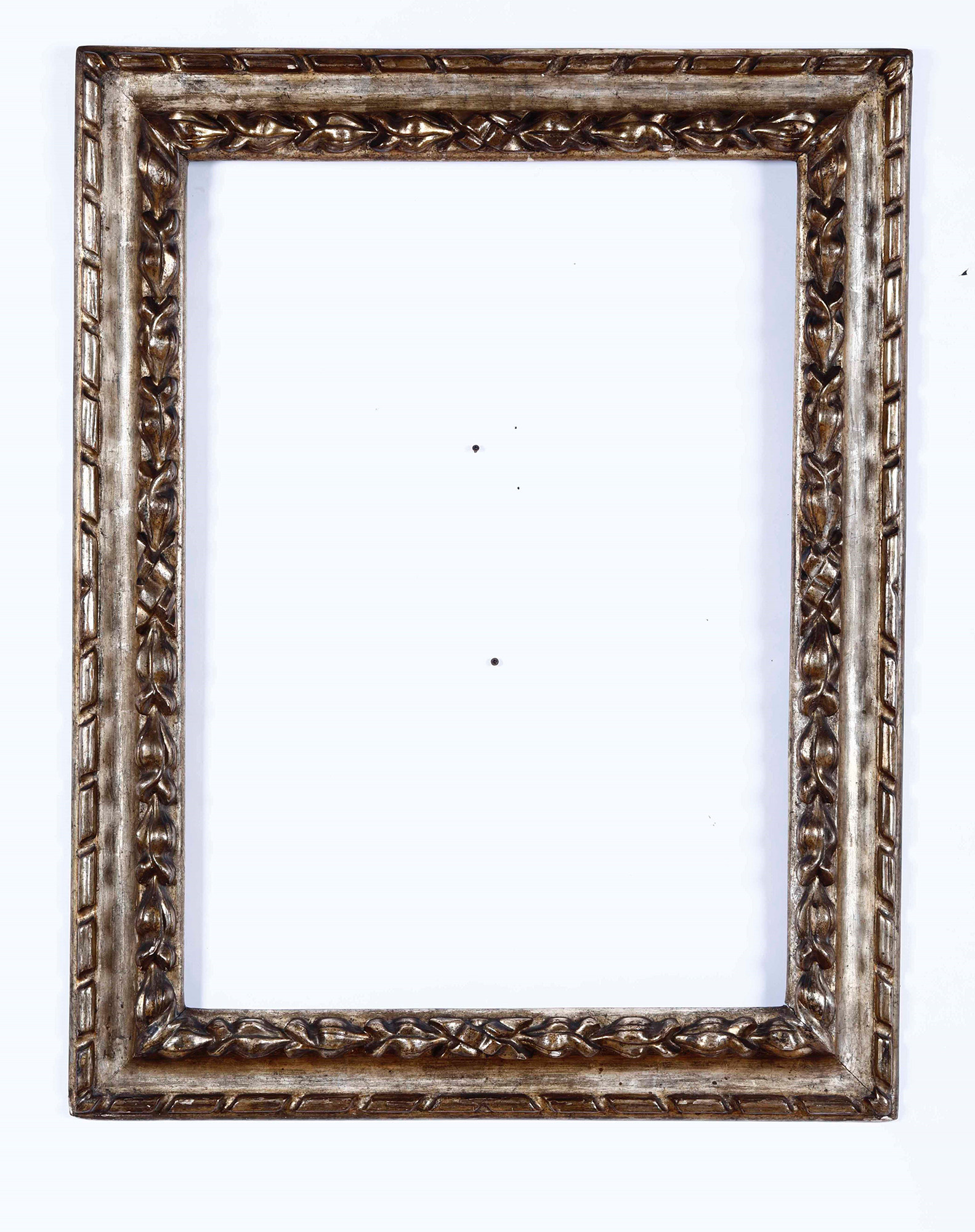 Cornice in legno intagliato e dorato a mecca. Emilia fine XVII secolo, battuta intagliata a fiori susseguenti, fascia liscia, profilo esterno a nastro, cm 113x88 luce cm 88,5x74