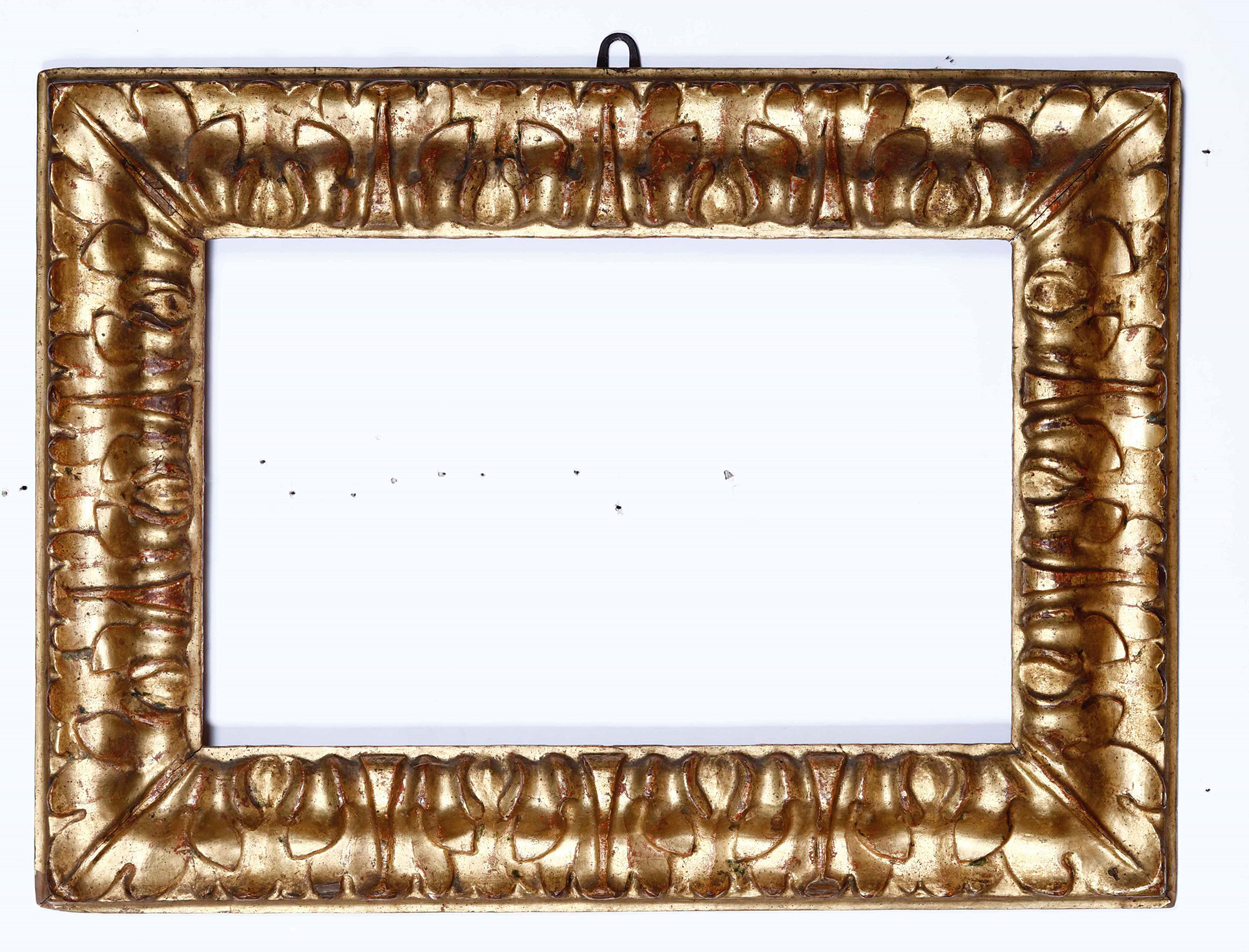 Cornice in legno intagliato e dorato. Bologna fine XVII secolo, battuta liscia seguita da fascia sagomata intagliata a foglie di cavolo, cm 43x59, luce cm 25,5x41