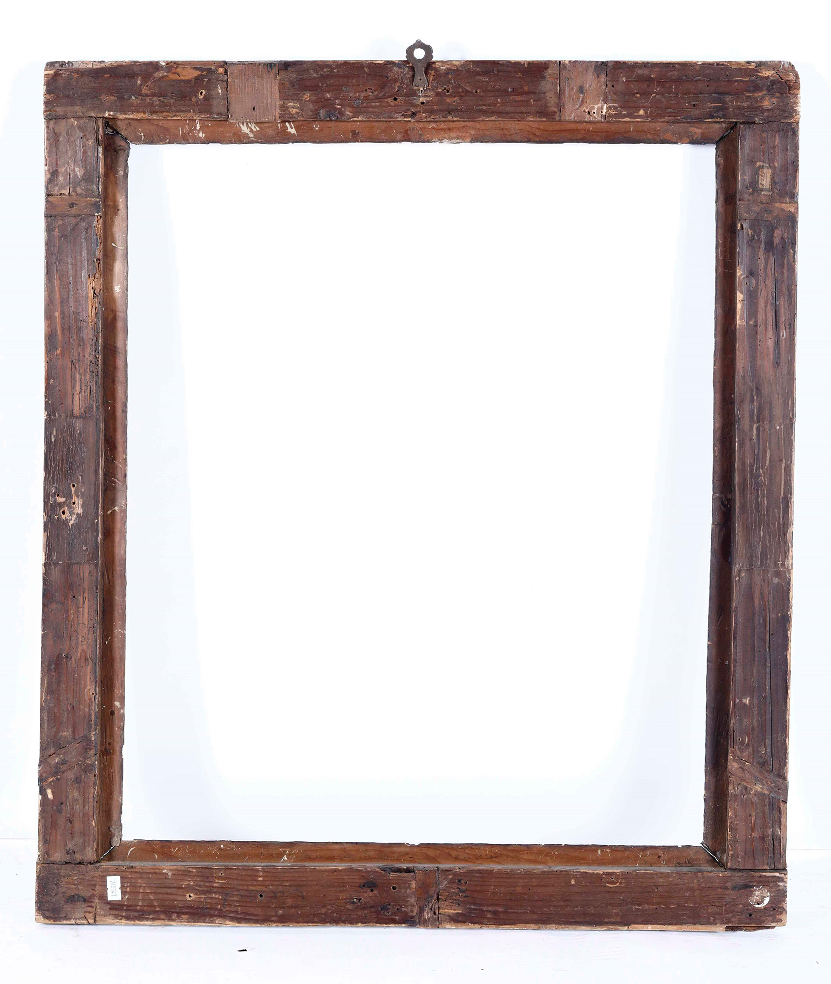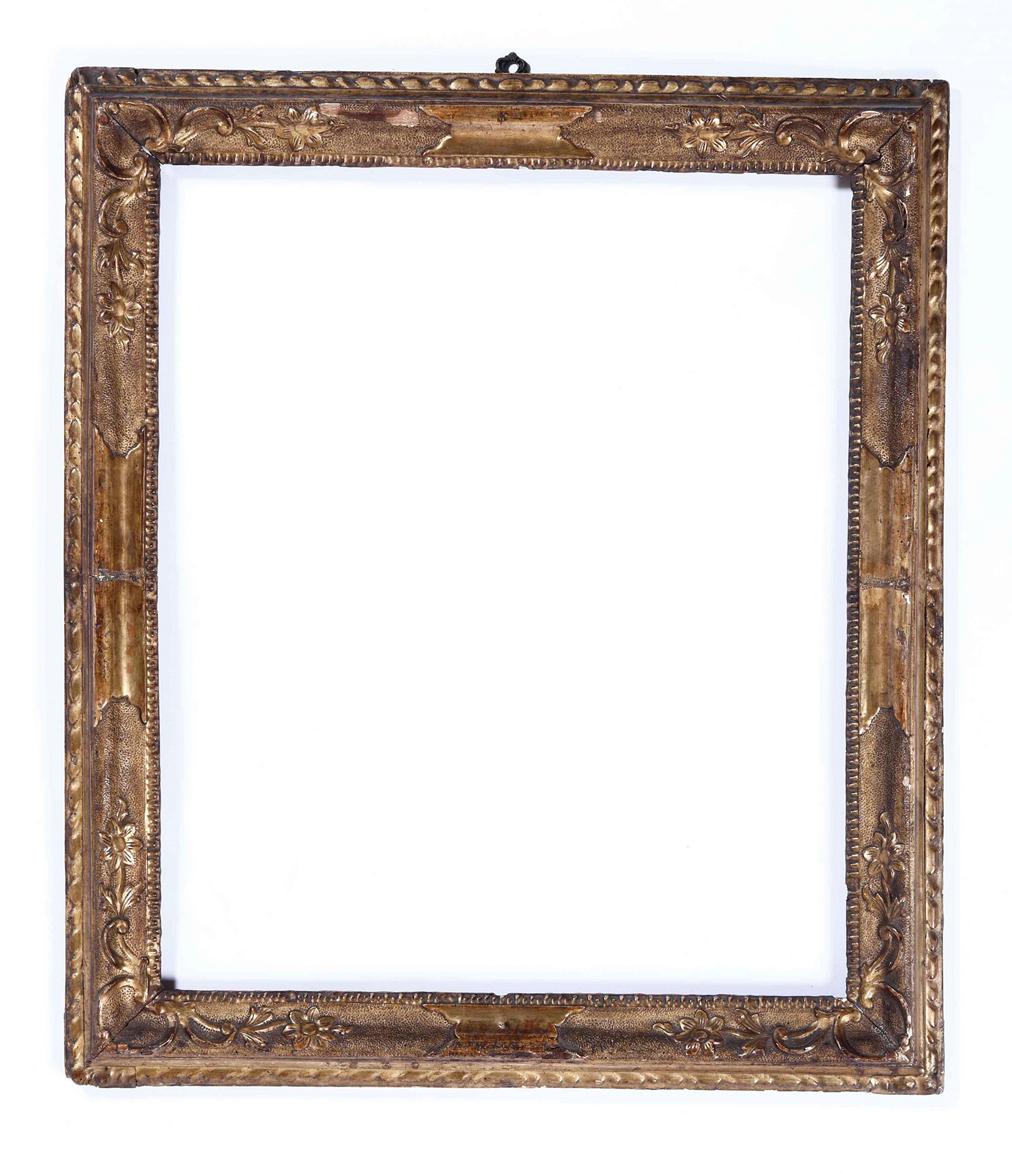 Cornice in legno intagliato, dorato e bulinato. Veneto XVIII secolo, decori agli angoli con motivi vegetali, floreali e volute, battuta cm 67,5 x 57, W. 68 - H. 78,5 Cm